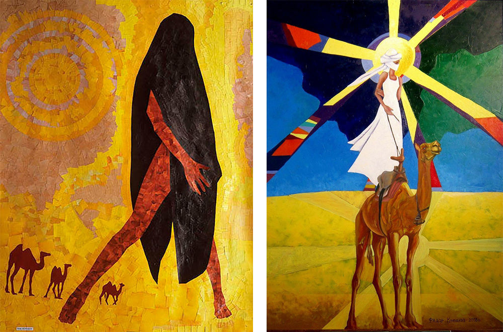 Одно из самых запоминающихся своих путешествий Федор Конюхов совершил в Африку. Впечатления от посещения чёрного континента путешественник отразил в серии работ, включающих и эти картины, символически изображающую свойственную Африке двойственность: консервативную закрытость исламского Севера и невероятную свободу нравов, царящую на Юге континента.