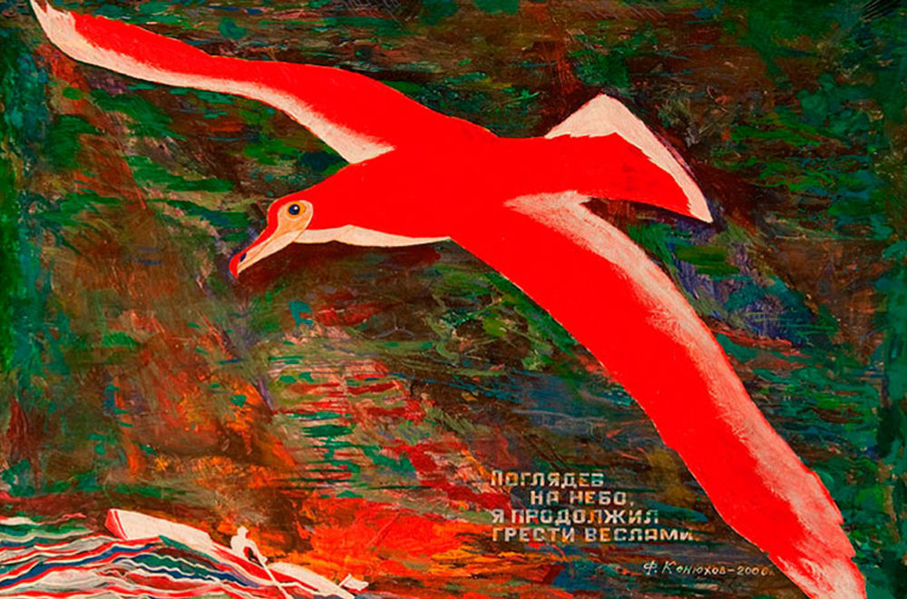Одна из самых знаменитых картин художника, под названием «Красная чайка». Это произведение было создано после тяжелейшей экспедиции в 2006 году. Пересекая океан только лишь на одной лодке, путешественник попал в сильнейший шторм. Федор Конюхов начал готовится к смерти, когда его мышцы атрофировались от нескончаемой гребли. Однако, через какое-то время он увидел берег и приближающийся к нему красную чайку. На картине посвященной этому инциденту художник написал: «Поглядев на небо, я продолжил грести веслами».
