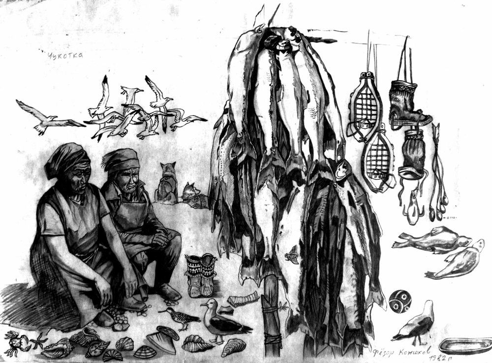 Особенного внимания заслуживают его графика – цикл рисунков о Чукотке произвёл фурор в Парижской национальной академии искусств. В ту пору Фёдор Конюхов, увлеченный романтикой увиденного, изображает и величественный морской пейзаж, и борьбу мужественных людей со стихией, и жизнь наших «братьев меньших».