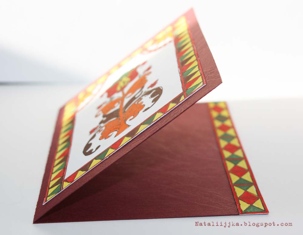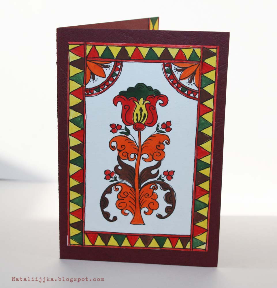 Продолжаю рисовать. Второй - отчетный урок по Борецкой росписи. Пробуем рисовать завитки, цветочки, листочки и - Дерево жизни. Мне страшно нравится само название этого элемента. Дерево жизни с цветком на своей вершине. Форма отчета - открытка. С удовольствием воспроизвела на ней одно из дерев. И добавила простой геометрический орнамент. Основа - визиточный картон. Простенько, но мне нравится) Хотела вокруг дерева жизни добавить завитков-цветочков, но не стала. Показалось, что будет лишним.