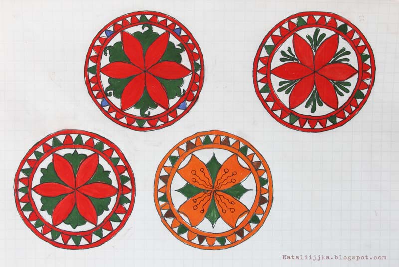 И еще пришлось немножко вспомнить геометрию - интересно, а все помнят, как разделить круг на шесть или восемь равных частей? Поразило, что и в середине 19 века в Борецкой росписи использовали циркуль для разметки кругов.