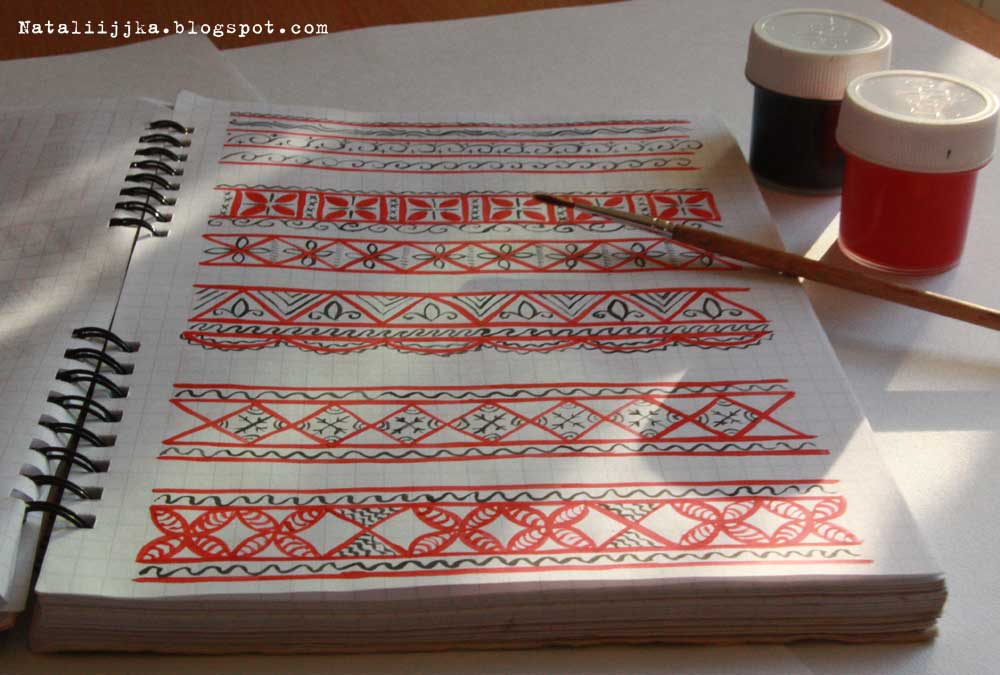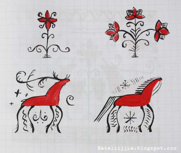Я подключилась к проекту чуть позже, поэтому уже успела посмотреть то, что может получиться в итоге - у Милочки и Елены. Мне очень нравится этот стиль. Особенно лошадки - безумно красивые! Но лошадки впереди, а пока у меня открыта моя новая ученическая тетрадь для прописей росписей: