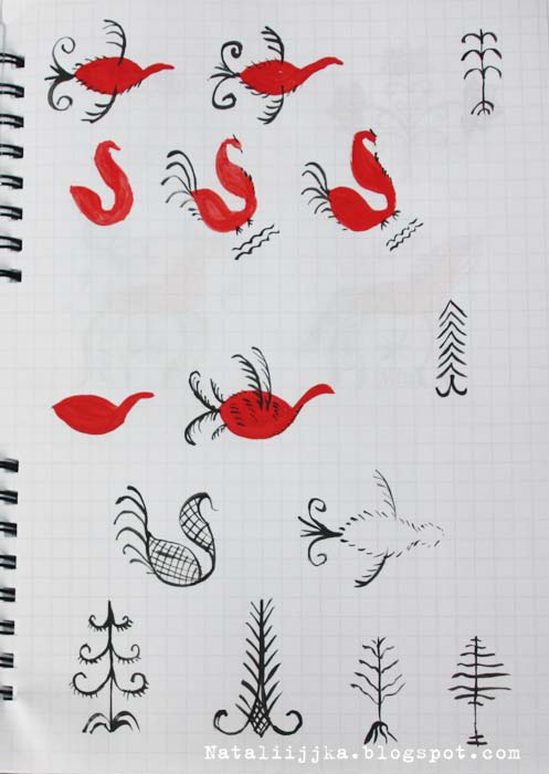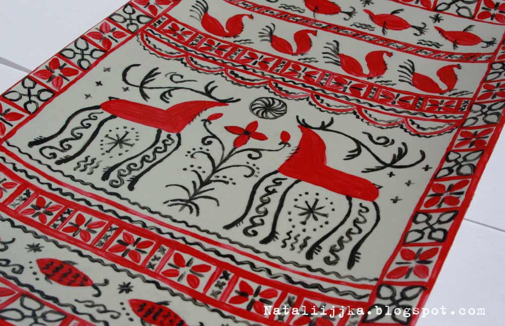 Сегодня у меня совсем коротенький отчет по росписи. Коротенький - потому что ничегошеньки не успеваю... С одной стороны, возросла нагрузка на работе, свободного времени меньше, с другой, наверное, опять разленилась и снова стала неорганизованной. Поэтому только сегодня знакомлю вас с животным миром Мезенской росписи. Мой узор:
