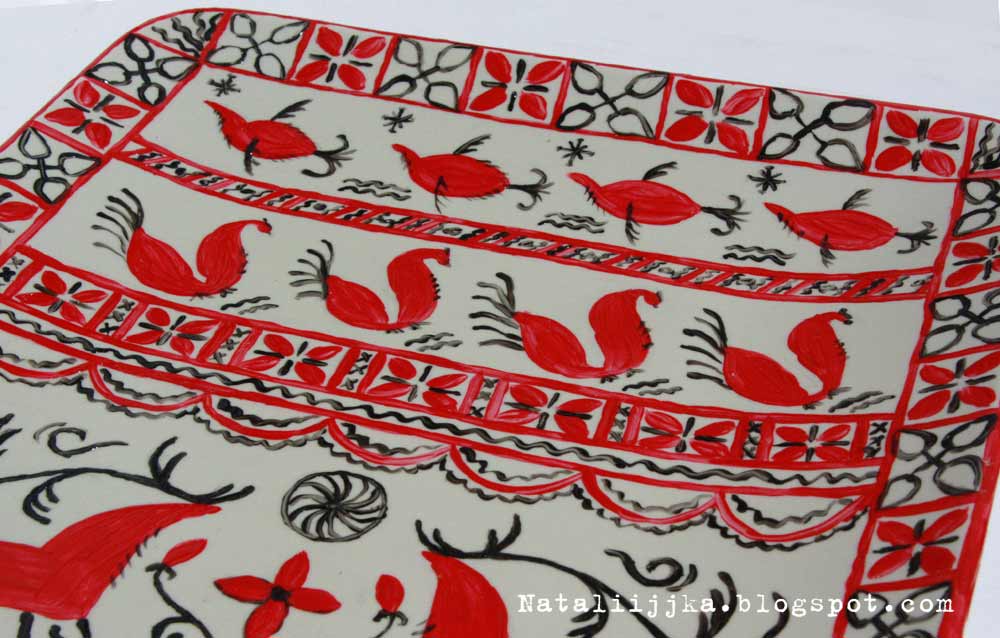 Давно не расписывала тарелки, соскучилась. Решила совместить приятное с полезным. Для отчета по мезенской росписи выбрала не доску, а блюдо. Могу сказать, что задачу себе поставила непростую - очень сложно рисовать тонкие линии красками по фарфору. Гуашью рисовать легче. Хочу попробовать мезенскую роспись на доске, но когда-нибудь попозже. А сегодня покажу то, что получилось.