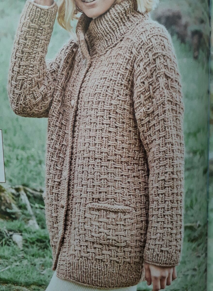 Снятые петли входа в карман перенести на спицу № 6 и для подогнутой обвязки провязать 4 ряда лицевой глади. Все петли закрыть как лицевые. Сложить обвязку на лицевую сторону и края пришить несколькими стежками к передней части. Сшить плечевые швы. Для двойного воротника-стойки по краю горловины набрать круговыми спицами 73 (81) петлю и вязать 1 изнаночный ряд и 1 лицевой ряд вязать лицевыми петлями. Со следующего изнаночного ряда вязать резинкой 1 на 1 через 22 см все петли закрыть и сложить воротник внутрь вдвое и изнутри прижать. Для планок полочки из каждой кромочной и из 2-х кромочных сложенного воротника набрать круговыми спицами 101 петлю и провязать 1 изнаночный и 1 лицевой ряд лицевыми петлями далее вязать резинку 1 на 1. У правой полочки на высоте планки 2 см распределить 6 петлиц. Вязать таким образом: 1 накид, 2 вместе л.п. (=1 снять как лицевую, 1 л.п., сверху накинуть непривязанную петлю). 1 петлица через 19 петель от низа, 4 петлицы через 12 петель. При ширине планки 4,5 см в изнаночной ряду закрыть все петли как лицевые. Вшить рукав в пройму и сшить боковые швы тела и рукавов. Пришить пуговицы.