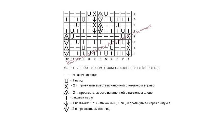 Раппорт узора состоит из 12 петель и 8 рядов.