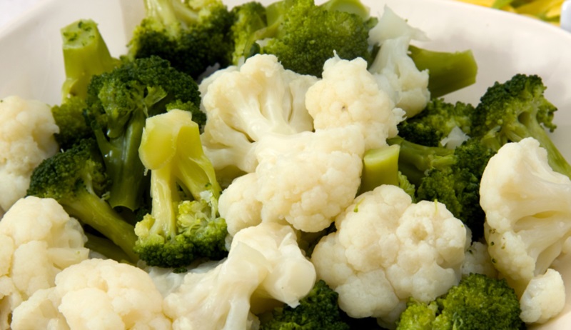Сначала разбери цветную капусту и брокколи на соцветия. Затем подготовь кастрюлю с кипящей водой и опусти в нее овощи. Бланшируй соцветия в течение 3 минут после повторного закипания. Потом слей жидкость из емкости и дай овощам остыть.