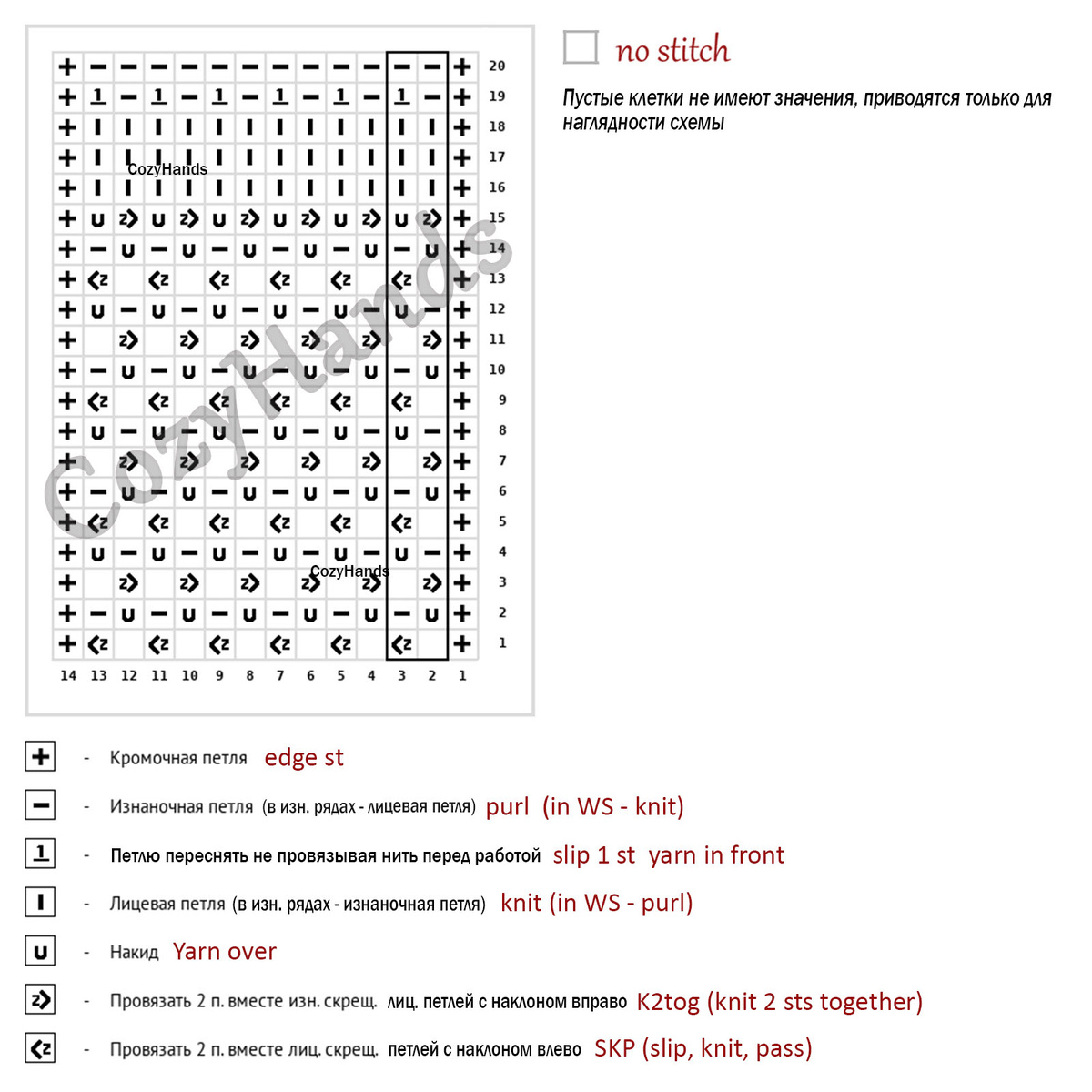 Раппорт узора состоит из 2 петель и 20 рядов.