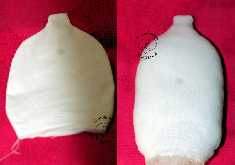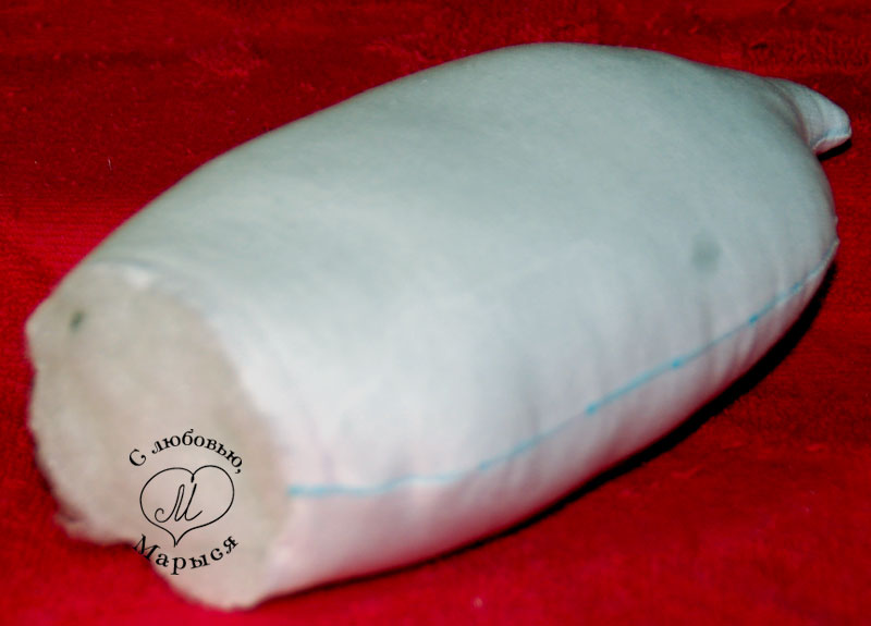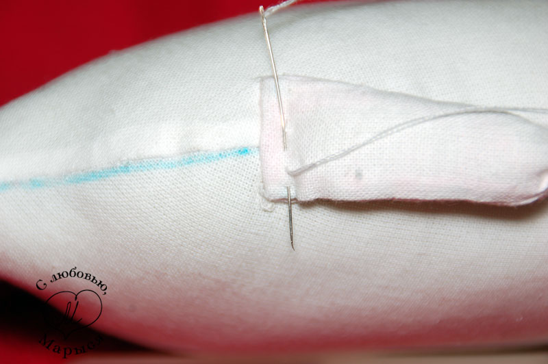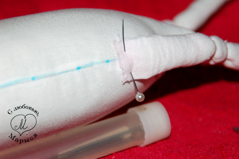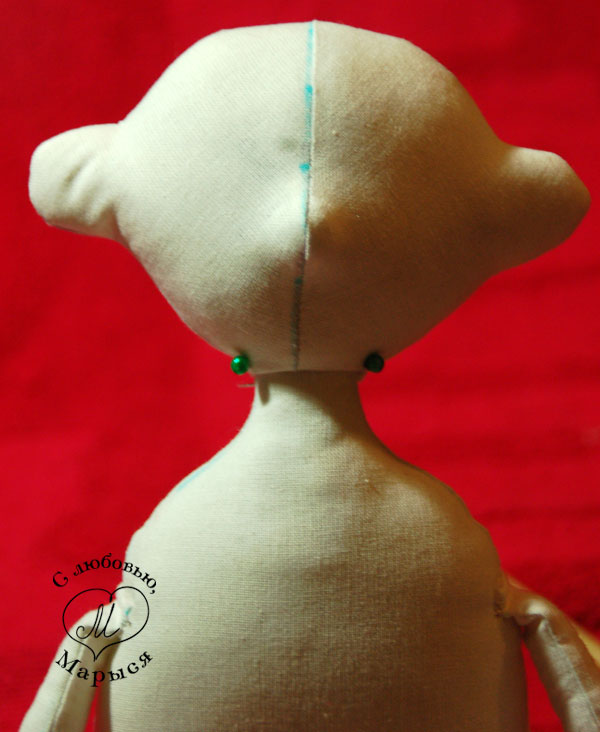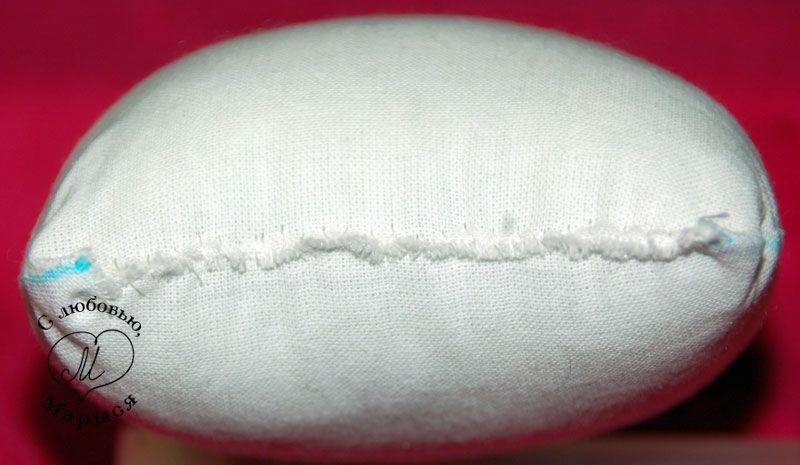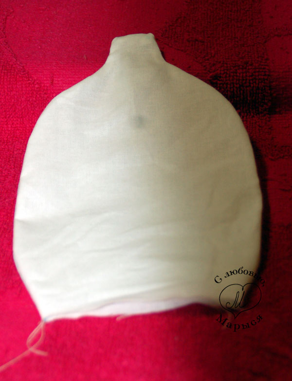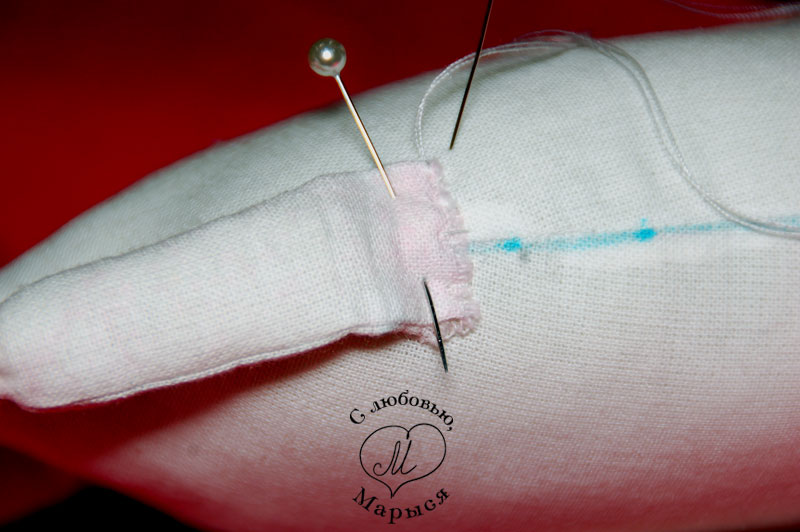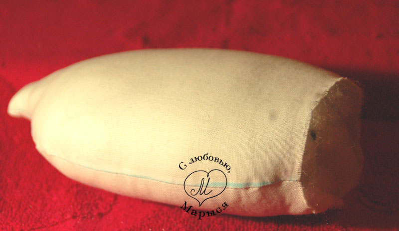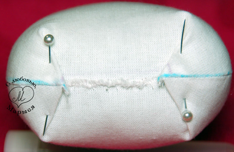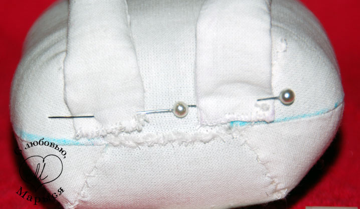 Но вернёмся к Макарке и просунем шею в отверстие внизу головы, предварительно пальцем утрамбовав набивку. Края ткани подворачиваем внутрь, и закрепляем всё вместе булавками.