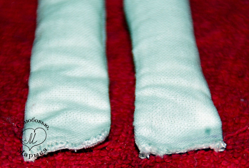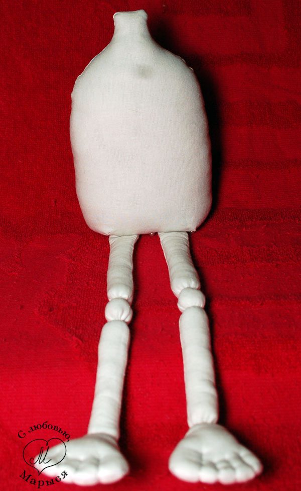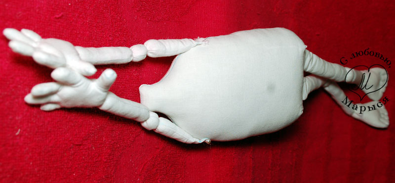 Запрокидываем всю конструкцию в такую мало приглядную, но технически необходимую позу и крепим ножки булавками. Обратите внимание, что срезы ножек прилегают к шву на туловище, а не накрывают его. Это делается для того, чтоб куколка могла сидеть.
