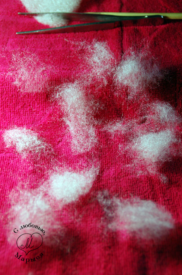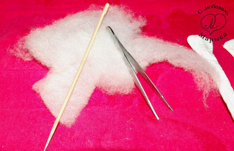 Берём те же инструменты и материалы, что и раньше: синтепон, деревянную палочку, пинцет (если есть, и вам показалось удобным его использовать)