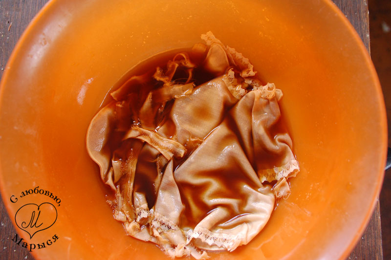Теперь достаём всё, что мы замачивали в кофейном растворе и прополаскиваем. Можно и не делать этого, тогда "старение" будет ещё более ярко выраженным. Просушиваем, если нужно, проглаживаем. Я прогладила, а потом снова слегка помяла.