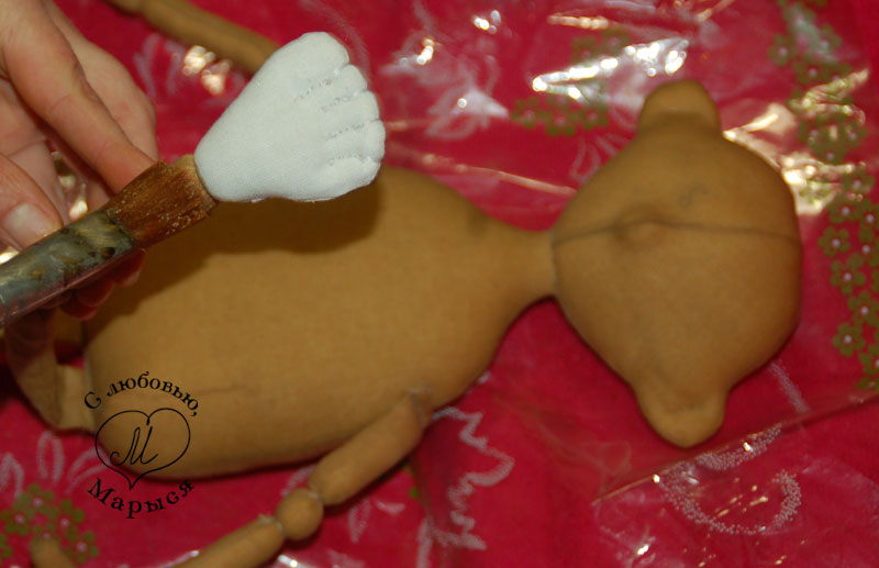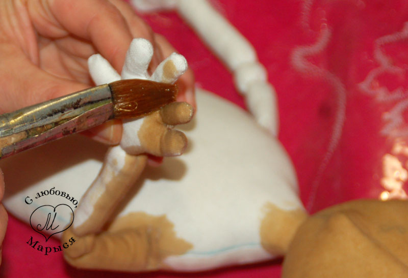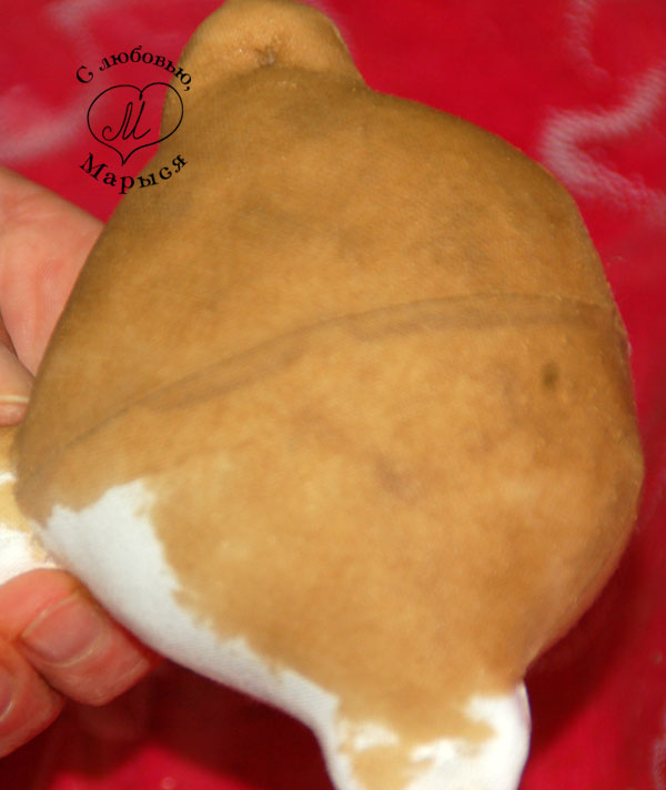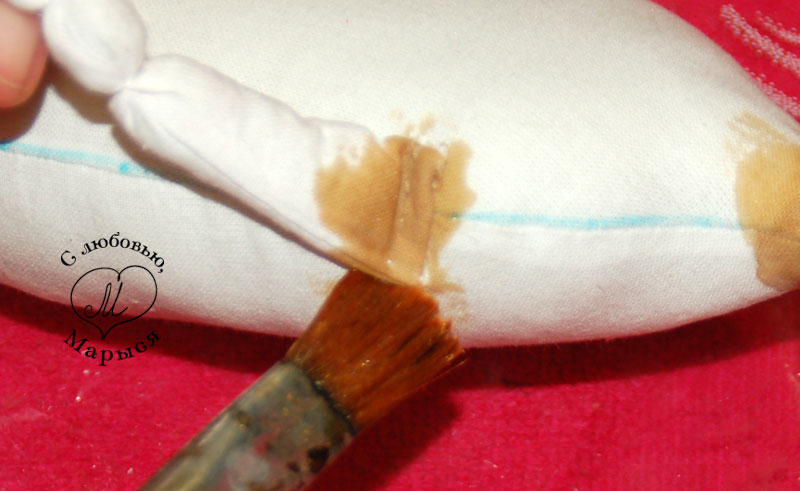 Ещё один маленький секрет. Положите куклу сначала лицом вверх, потому, что вероятность образования пятен тем выше, чем влажнее поверхность тела куколки, а пятна на затылке и спинке легче замаскировать.