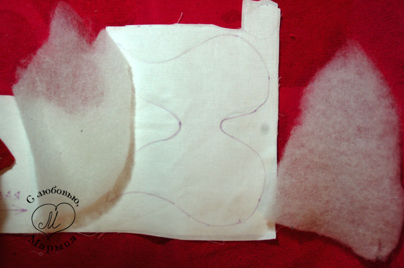Прострочите по контуру, сделав шаг машинки побольше, чем когда строчили детали без синтепона. Не забудьте оставить не застроченным отрезок для выворачивания. После того, как прострочили контур, вырезайте с припуском 0,5 - 0,7 см.