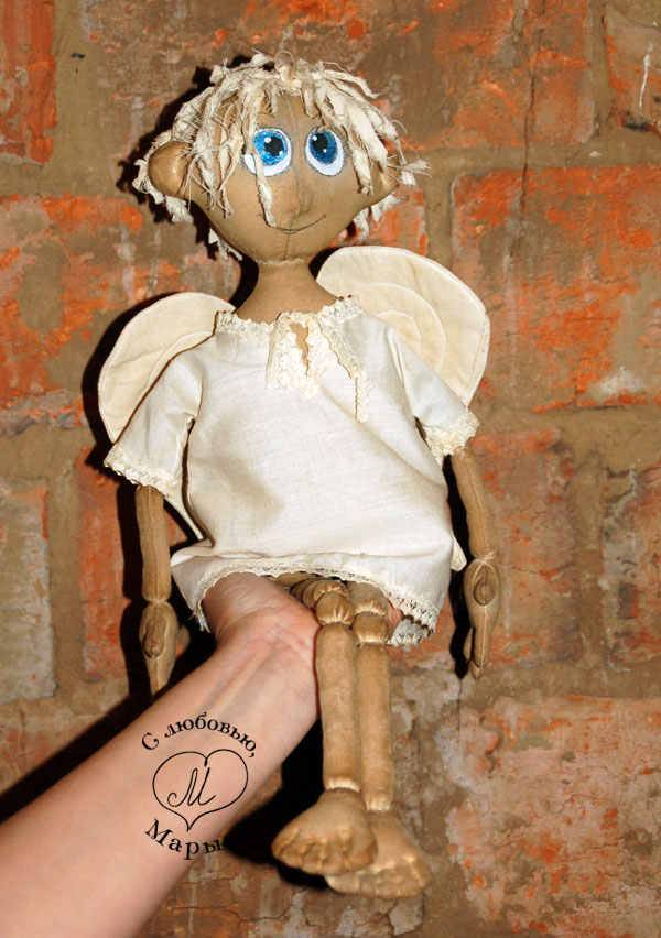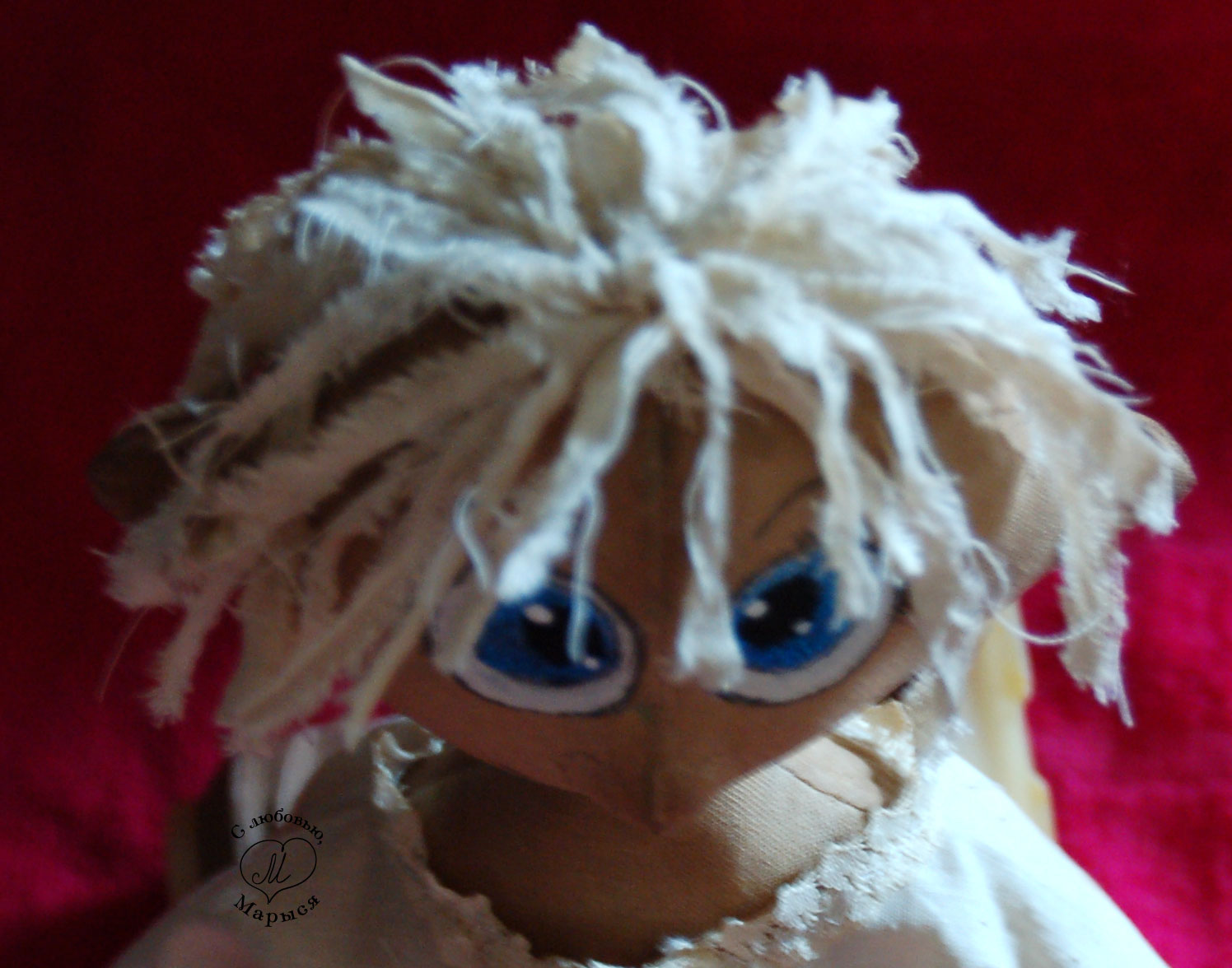 Ну или, например вот, как у старшего брата Макарки, ангела Василия. Кстати, можете посмотреть как выглядит не тонированная кукла, и волосики из тонких ниток, а за одно и другой вариант росписи личика. Я не буду подробно останавливаться на этом моменте, скажу только, что также, можно личико вышить, использовать готовые глазки, нарисовать их другими способами. Это уже на ваше усмотрение и желание. Если решите рисовать, и раньше этого не делали, потренируйтесь сначала на бумаге, потом на кусочке ткани, и только потом на кукле.