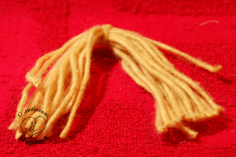 Не вынимая нитки, закрепляем пучок булавкой в месте стяжки и пришиваем к макушке. Если куклой будут играть дети, то пришивать нужно покрепче.