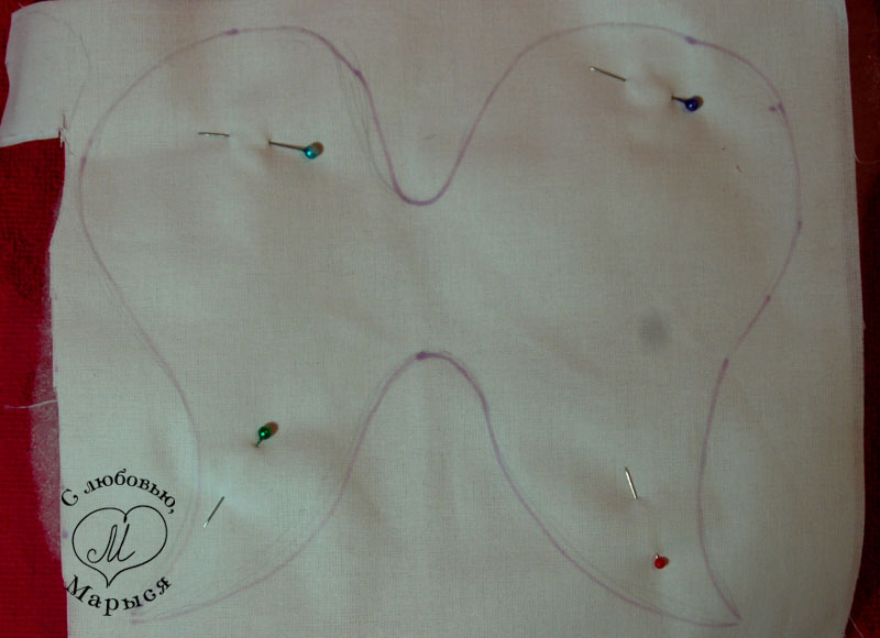 Положите нарисованные на ткани, сложенной вдвое, крылышки на синтепон и приколите булавками.