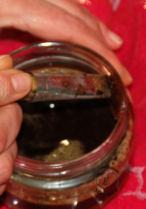 Рецепт раствора для тонировки такой: на пол стакана тёплой воды - 1 столовая ложка кофе и 1 столовая ложка клея ПВА. Всё тщательно перемешать. Когда вы освоитесь с этим процессом, то сможете сами менять рецепт. Добавляя кофе, вы получите более тёмный оттенок, добавляя ПВА, более твёрдую корочку. Но это будет потом, а пока, доверьтесь мне. Ещё несколько рекомендаций по тонировке: начинайте тонировать с затылка; не перескакивайте с одного места на другое, тогда раствор ляжет ровнее; тщательно тонируйте места стыков деталей, перетяжек, швы; весь процесс тонировки нужно закончить за один раз, не отвлекаясь, не делая перерывов, тогда тон будет равномерным. Обмакиваете кисточку в раствор, отжимаете её о край банки (или что у вас) и получаете удовольствие от процесса. А теперь без перерывов на комментарии, начали!