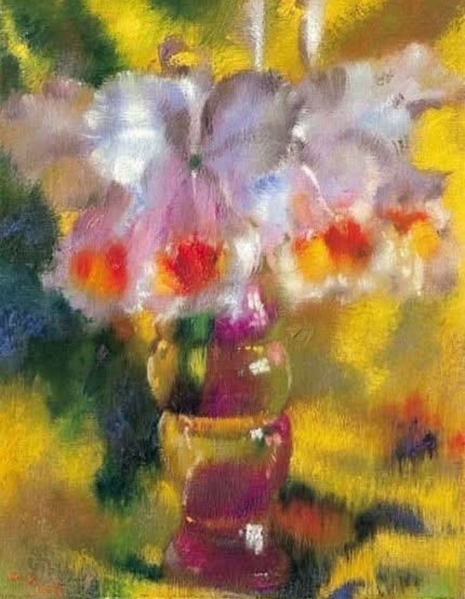 «Орхидеи на жёлтом грунте» (1928) — орхидеи на ярком солнечном фоне фоне, где каждый лепесток словно светится;