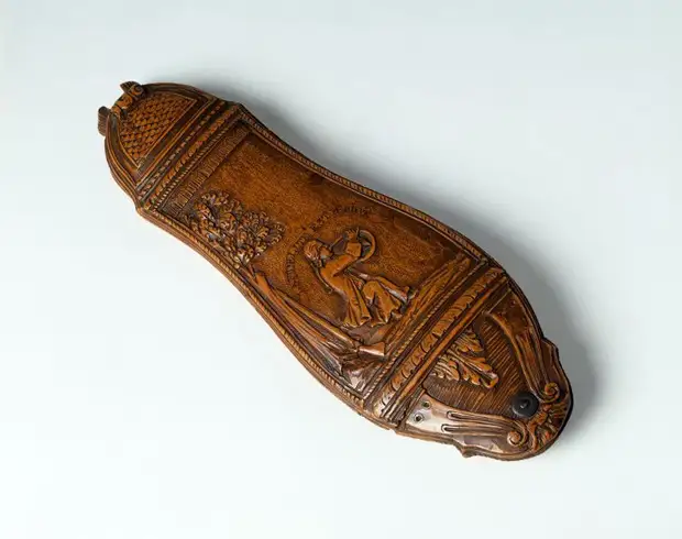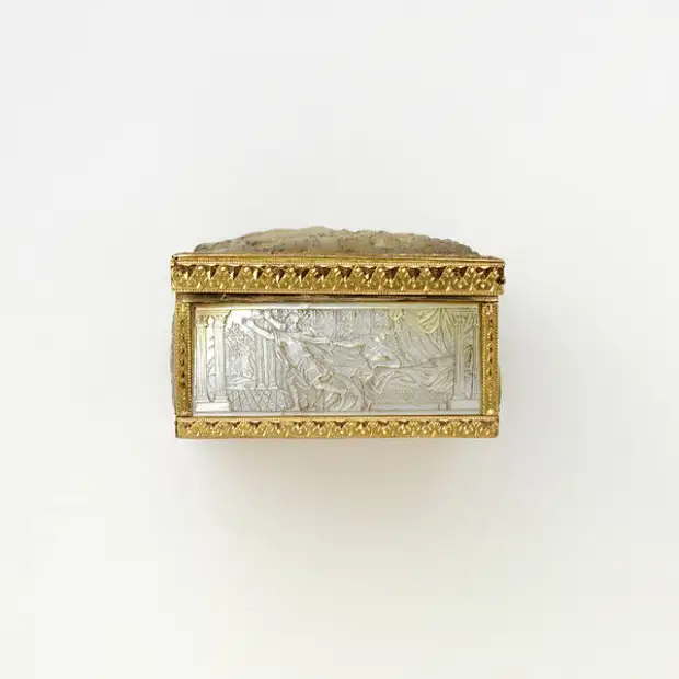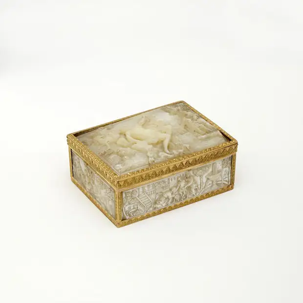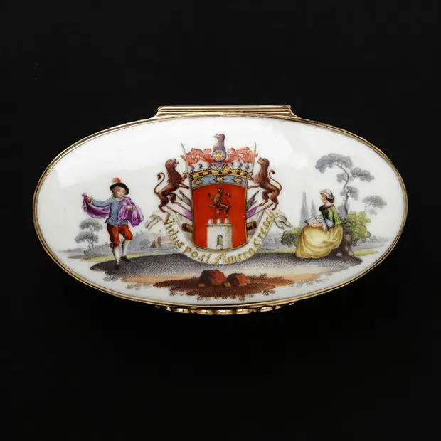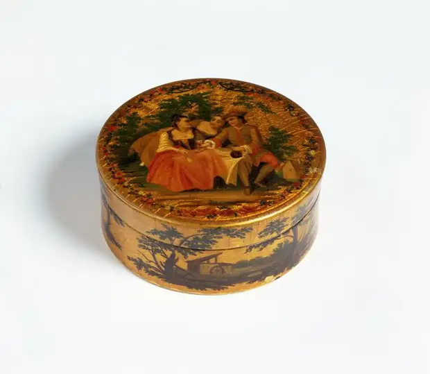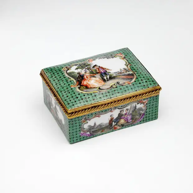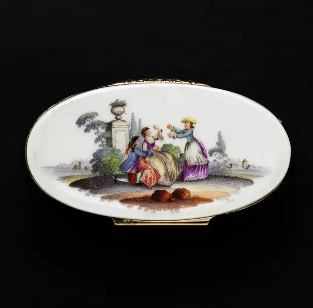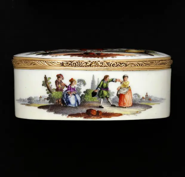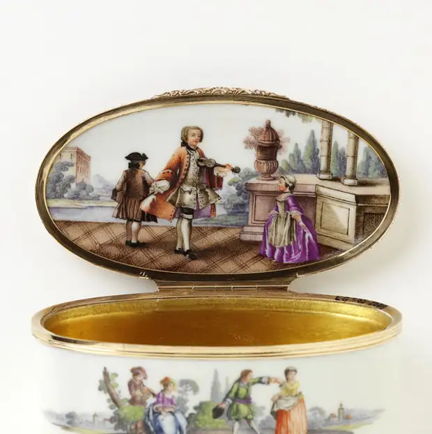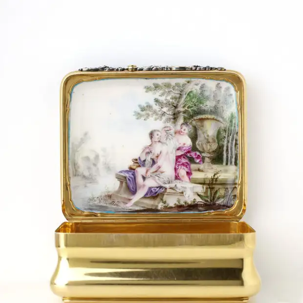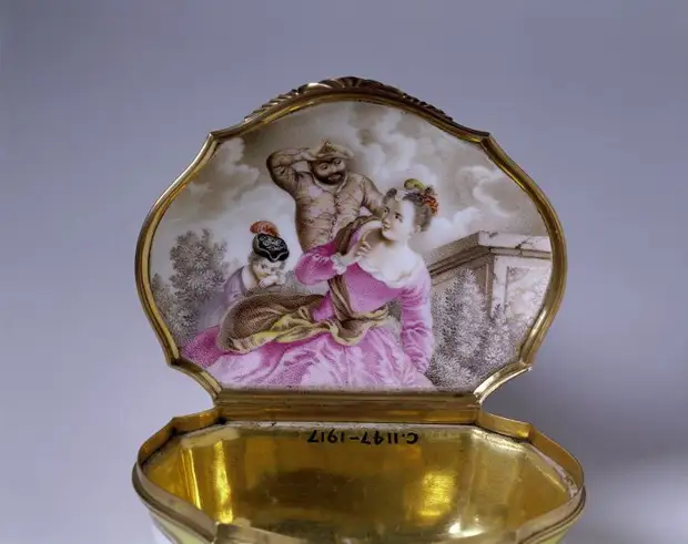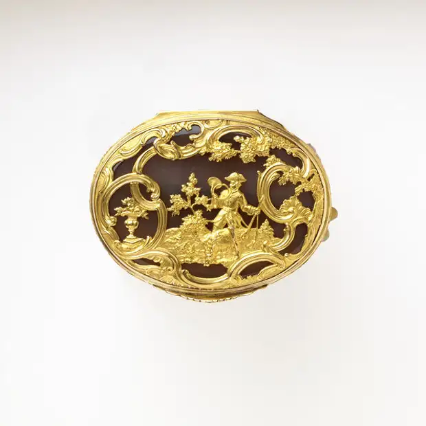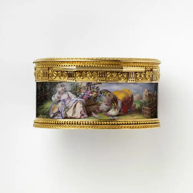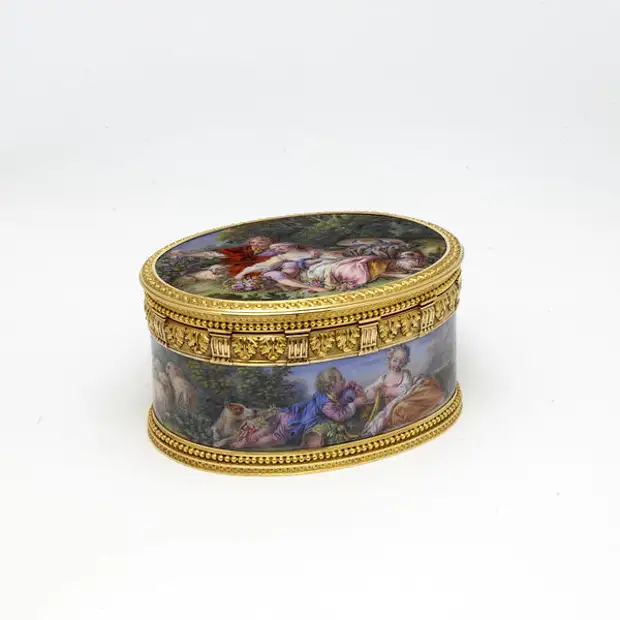 Очаровательная сцена украшения верхней части из Бергер, картина Франсуа Буше (1703-70), в настоящее время находится в Собрании Уоллеса, Лондон. Предполагается, что миниатюры были написаны Шарлем Николя Доденом, выдающимся художником королевской фарфоровой мануфактуры в Севре, в 1765 году. Сцены ухаживания и сельской жизни кисти Буше были популярным источником украшения золотых шкатулок.