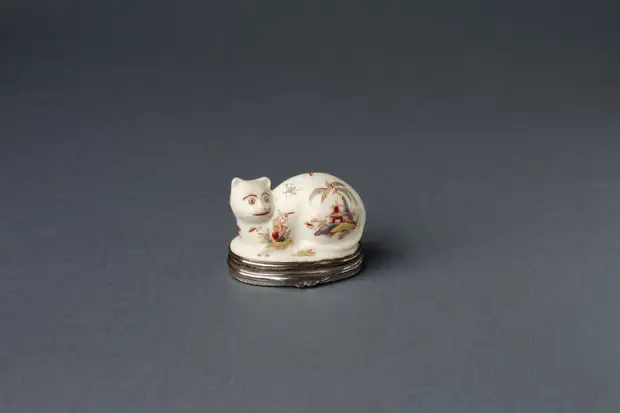 Табакерка и крышка из мягкого фарфора, расписанного эмалями, имитирующими японскую керамику какиэмон, с шарнирной серебряной оправой.