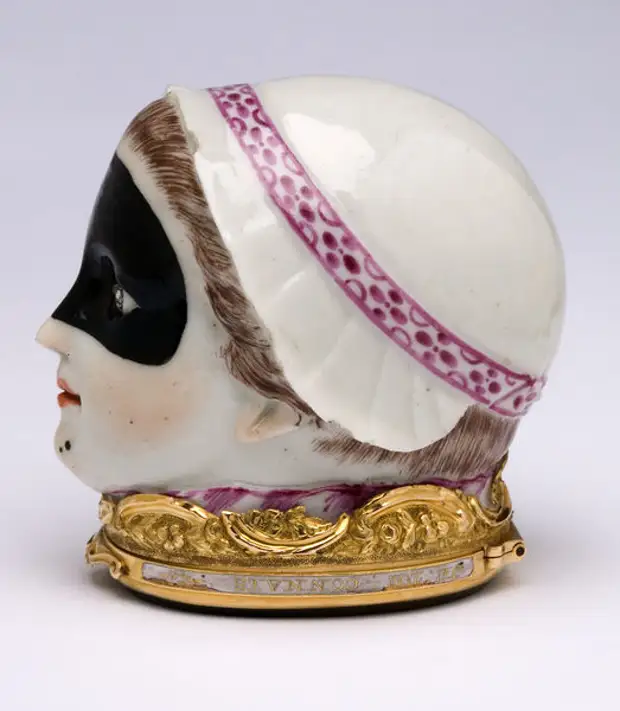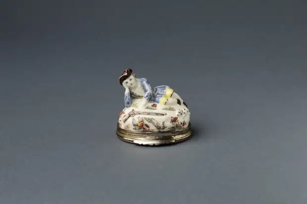 Мягкий фарфор, расписанный эмалями и оправленный в серебро.