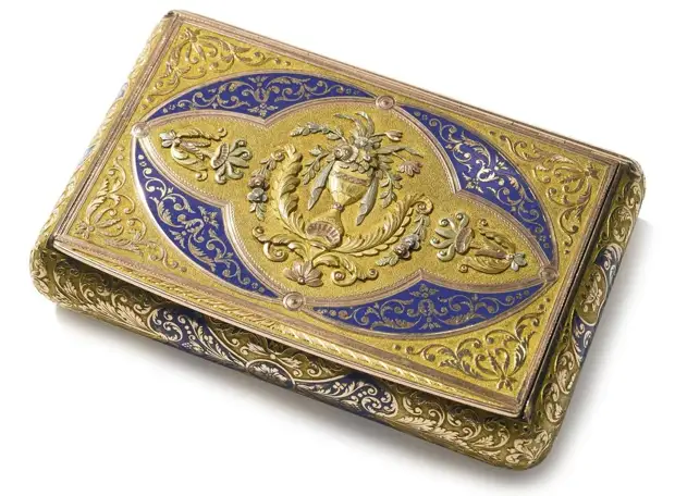 Табакерки, часто богато украшенные, были популярным аксессуаром в XVIII и XIX веках, когда нюхательный табак был распространенным явлением. Представленный образец имеет золотую отделку с синей эмалью и замысловатым рельефным декором.