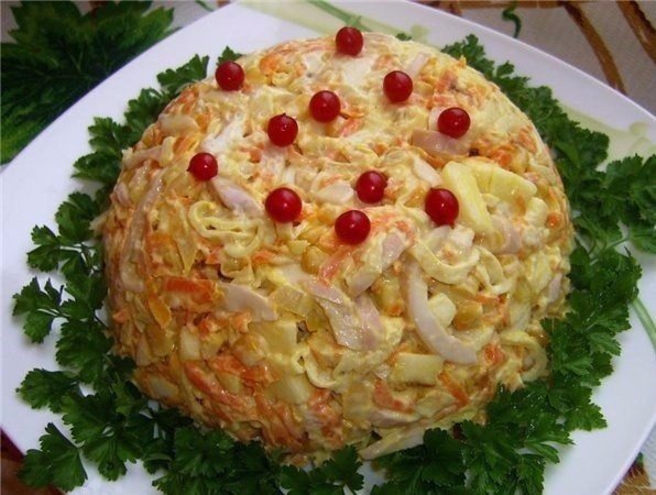 3 тушки кальмара, 1 б.консервированной кукурузы, 3 яйца, 2 большие моркови, 1 средняя луковица, 1 большое сладкое яблоко, читать далее