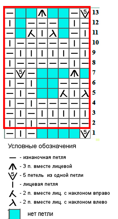 Рельефный узор с выпуклыми листочками с описанием. Раппорт 4 петли, 12 рядов. Набирается количество петель кратно 4 + 3 петли для симметрии + 2 кромочные. Листочки небольшие, слегка выпуклые. Узор подойдет для толстых ниток и ниток средней плотности, для любых изделий.