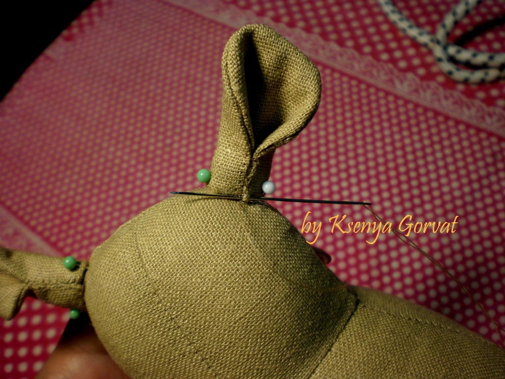 вставляем верхнюю часть головы и сшиваем, оставляя отверстие что бы вывернуть