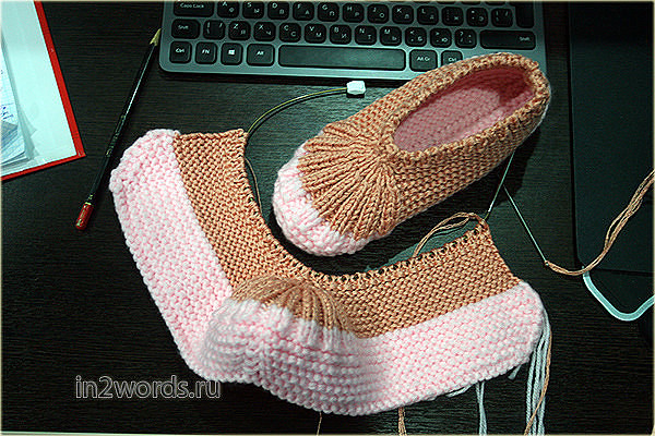 Получается полотно выпуклое в серединке. Это и есть мысок. Начало вязания это середина стоп и пятки. Заготовка тапка и готовый показаны на фотографии ниже