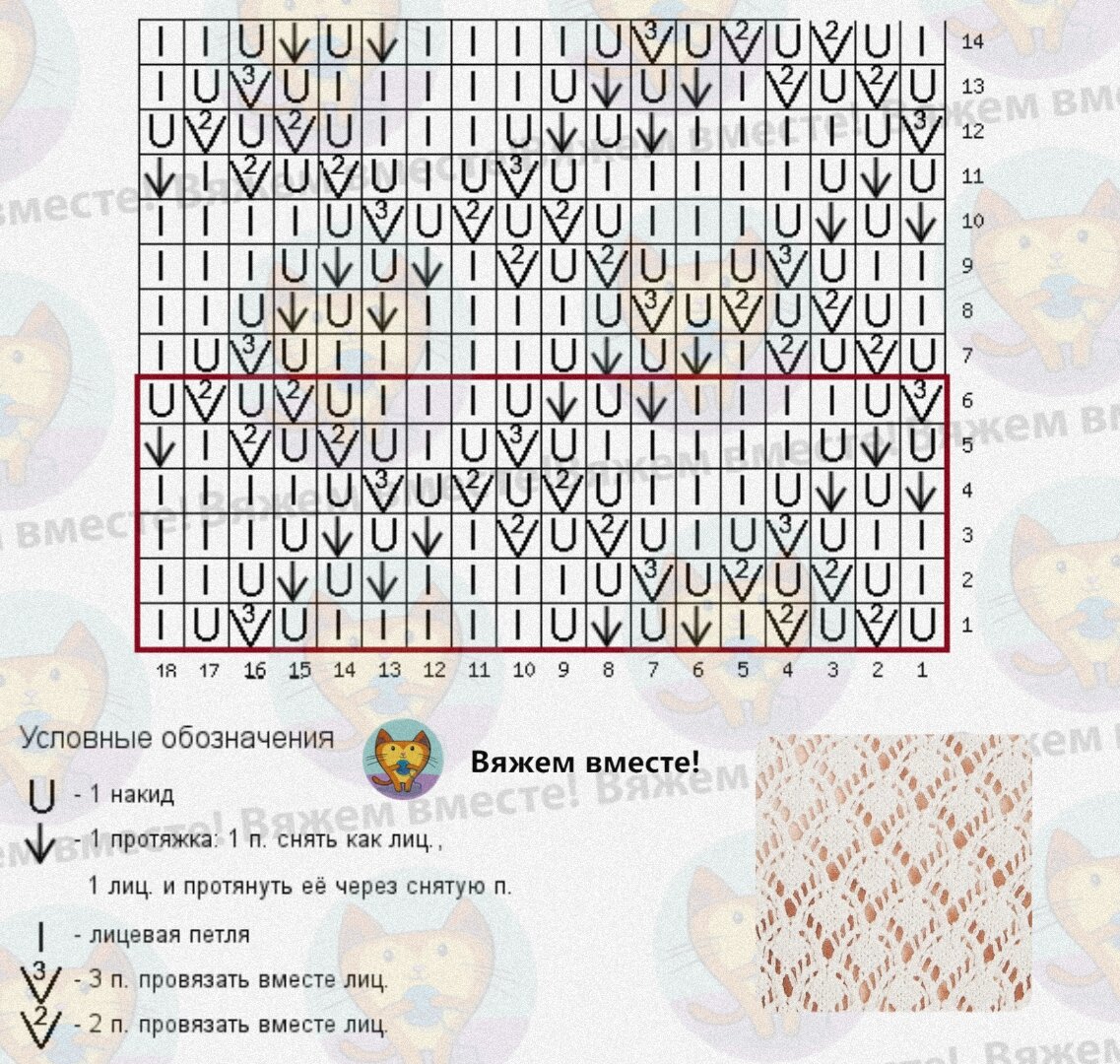 Раппорт узора составляет 18 петель по ширине полотна и 6 рядов по высоте.