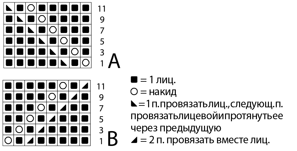 Вязать по схемам А и В лицевой гладью. Ширина раппорта = 8 п. В высоту повторять с 1-го по 12-й ряд.