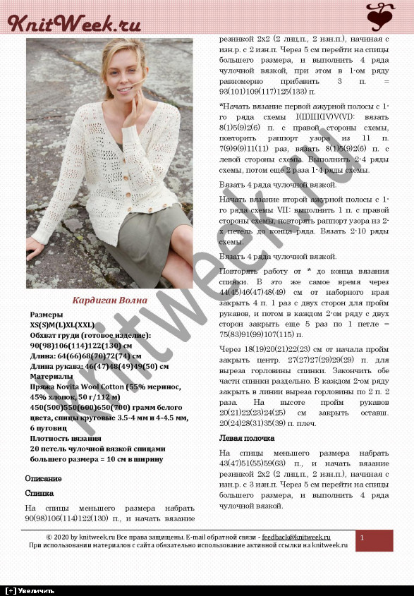 Нарядный женский кардиган, связан из смесовой пряжи на основе шерсти мериноса и хлопка, спицами от 3.5 мм до 4.5 мм в зависимости от вашей плотности вязания. Модель выполнена ажурными узора по приведенным в описании схемам в сочетании с полосами лицевой глади.