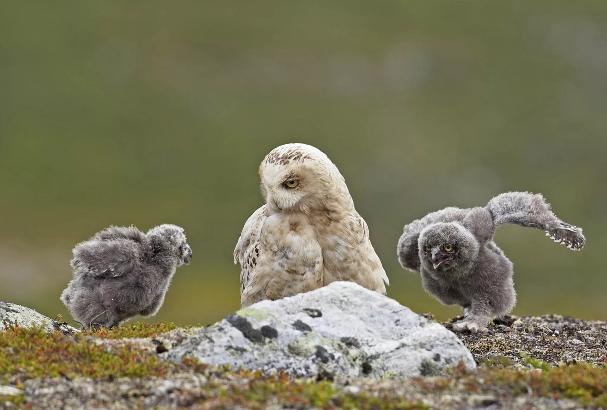 Первые птенцы вылупляются в июне, когда еще лежит снег, а через пару месяцев весь совиный выводок уже поднимается на крыло. Родители выкармливают маленьких совят леммингами, а если этого не хватает, ловят молодых куропаток или других небольших птиц.