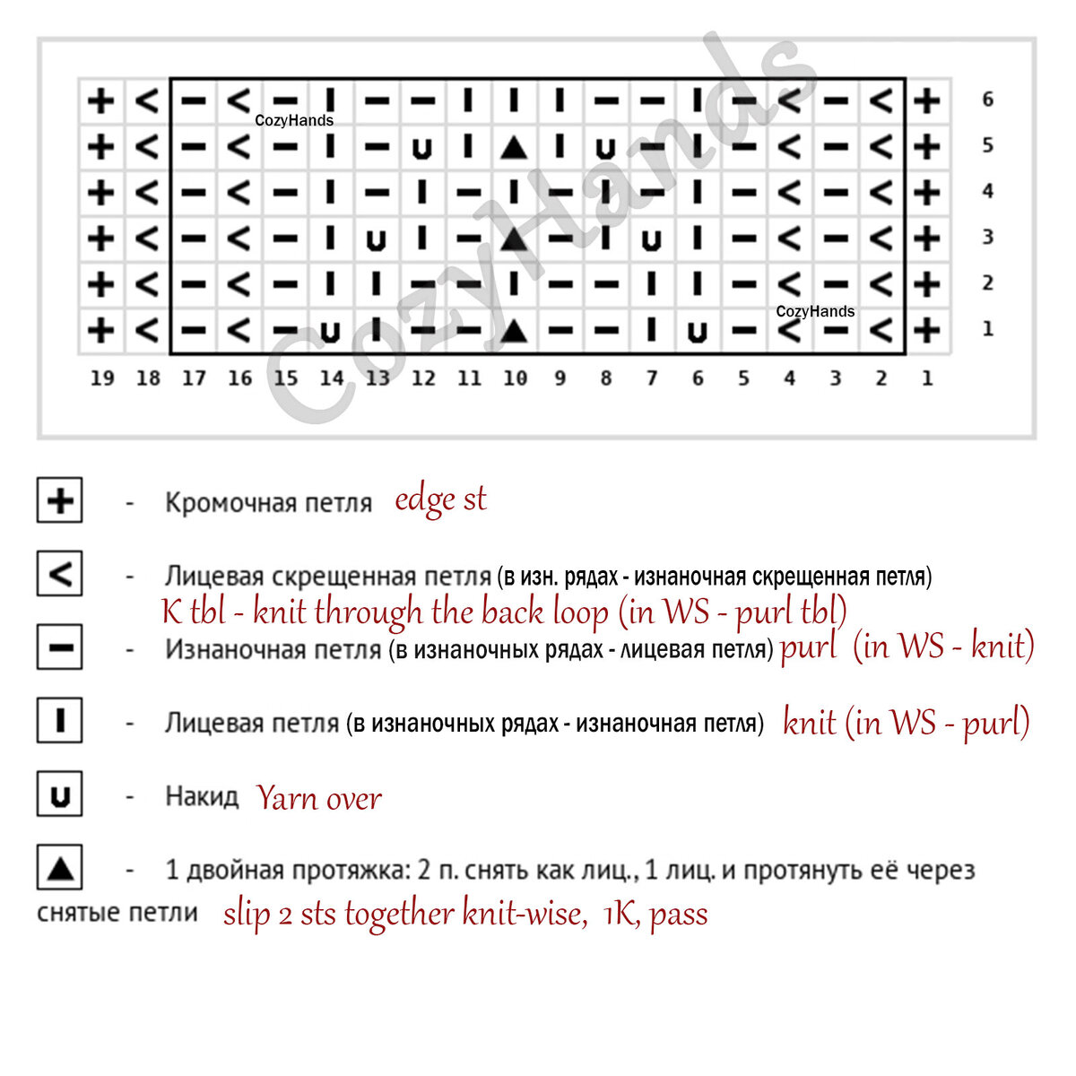 6 ряд: кром.п., * 1 изн.скрещ.п., 1 лиц.п., 1 изн.скрещ.п., 1 лиц.п., 1 изн.п., 2 лиц.п., 3 изн.п., 2 лиц.п., 1 изн.п., 1 лиц.п., 1 изн.скрещ.п., 1 лиц.п., * 1 изн.скрещ.п., кром.п.