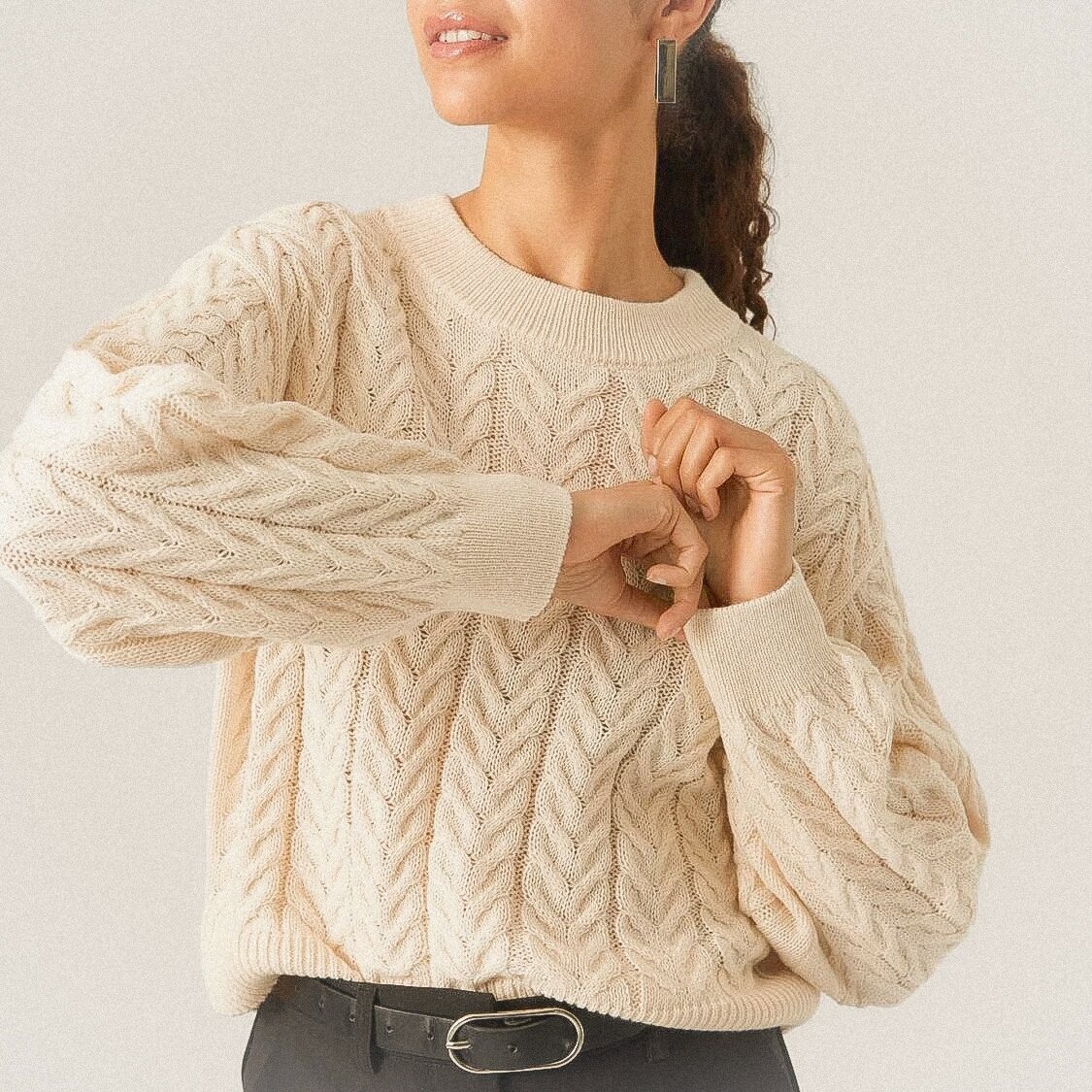 Кремовый джемпер украшен вертикальными двойными косами, разделёнными тяжами изнаночных петель.