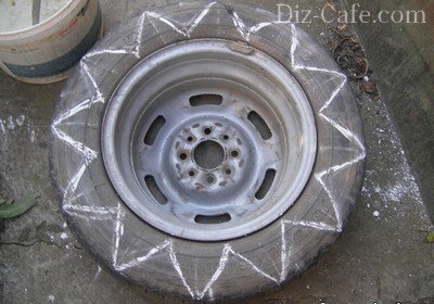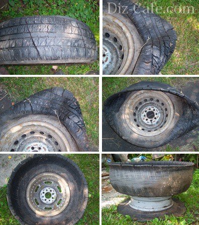 Как правильно подобрать шину? Отлично, когда есть возможно есть выбора. Выбирая между старыми покрышками отечественного производителя и импортными изделиями, предпочтение следует отнести в сторону последних. Импортные отработанные шины имеют более мягкую и тонкую резину, с которой намного проще работать. Если же выбирать между «летней» и «зимней» резиной, то для работы больше походит зимний вариант. Решая создать оригинальные клумбы из шин своими руками, превратив старые отработанные покрышки в уличные вазы причудливых форм, необходимо заранее подготовить исходный материал и продумать его оформление Для того, чтобы сделать клумбу из старой покрышки, желательно выбирать колеса с максимальным износом протектора. Стертый слой протектора делает изделие более мягким и позволяет значительно облегчить процесс выворачивания его наизнанку.