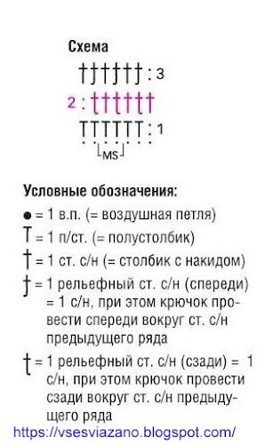 Основной узор: вязать ст. с/н. Каж¬дый ряд начинать с 2 в.п. подъема вместо 1-го ст. с/н, заканчивать 1 ст. с/н в верхнюю в.п. подъема преды¬дущего ряда. Начиная со 2-го р., ст. с/н вязать за ст. с/н предыдущего ряда.