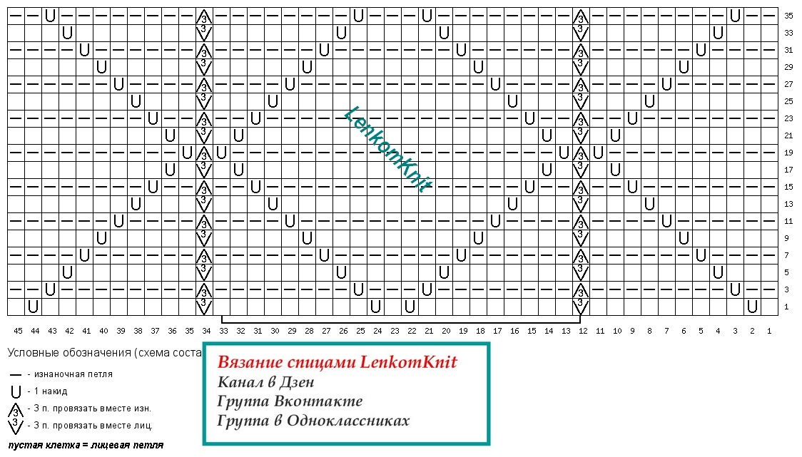 На схеме нарисованы лицевые ряды фактурного узора, один раппорт в высоту. Изнаночные ряды вяжем так, как лежат петли.