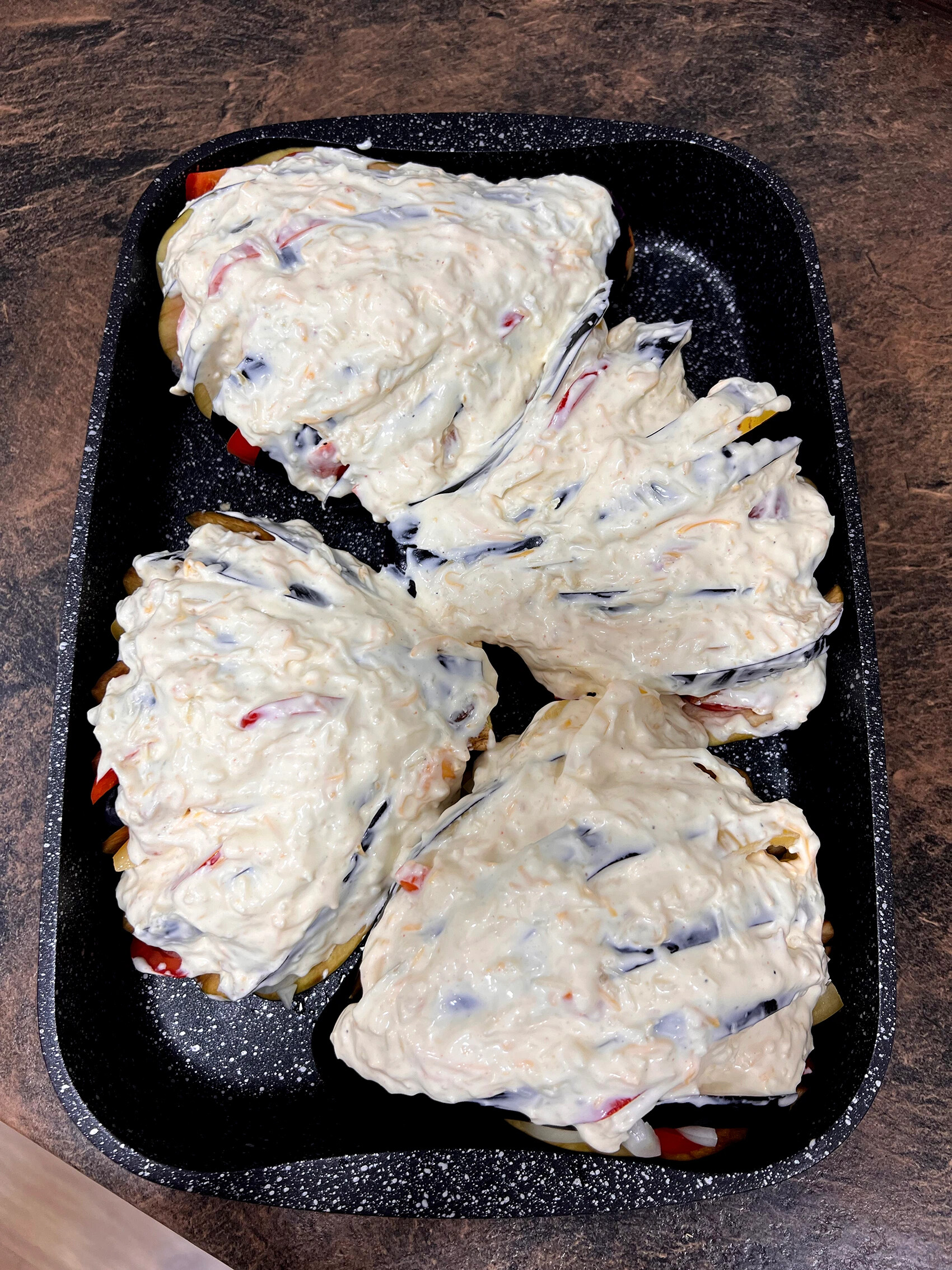 Здесь сразу хочу отметить, что да, майонез можно заменить сметаной. Но тогда соус получается более жидкий. Сыр из рецепта не убирайте - получится совершенно не то. Солю по вкусу. Можно добавить черного молотого перца. Перемешиваю и выкладываю сверху на баклажаны. Примерные пропорции: