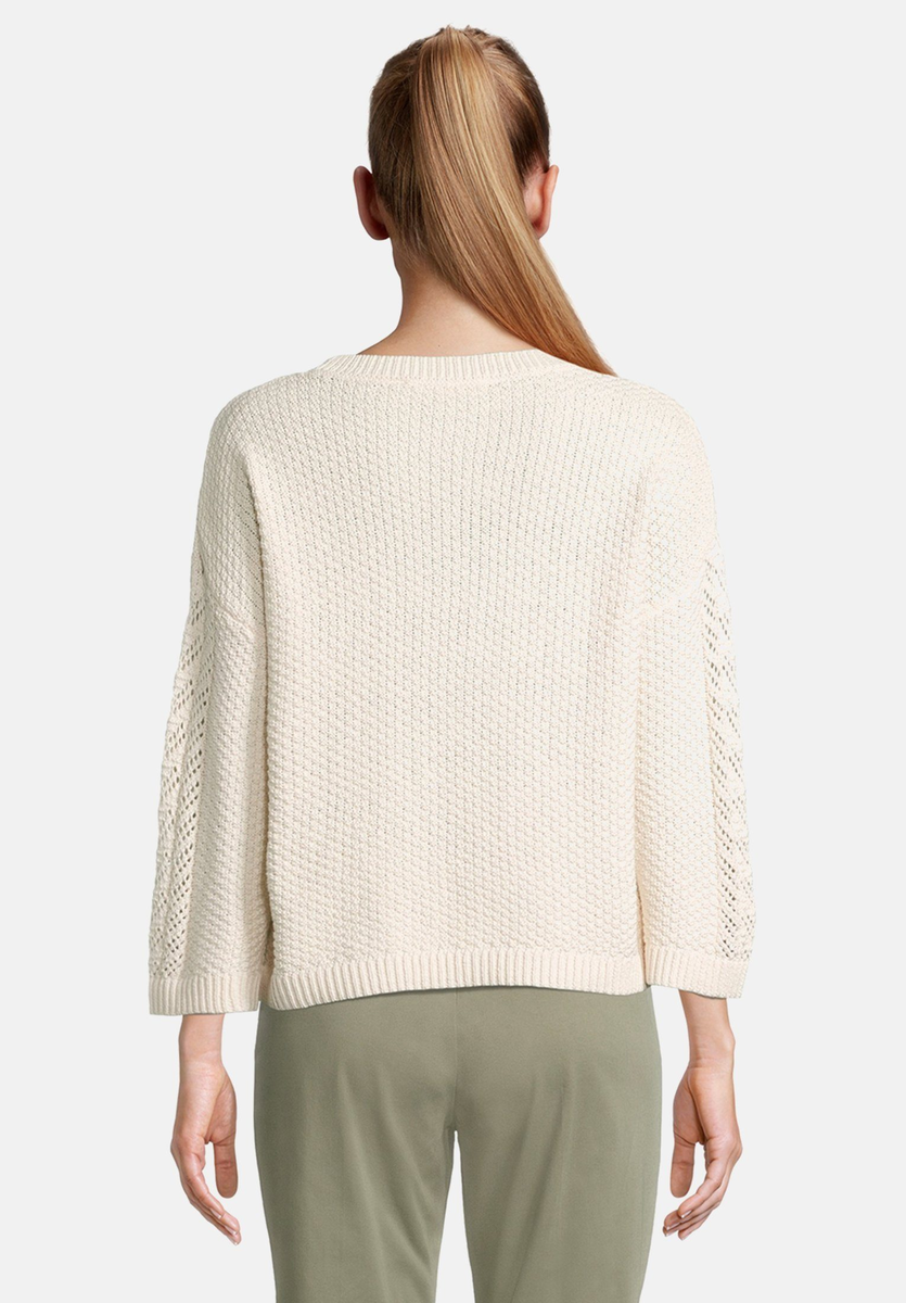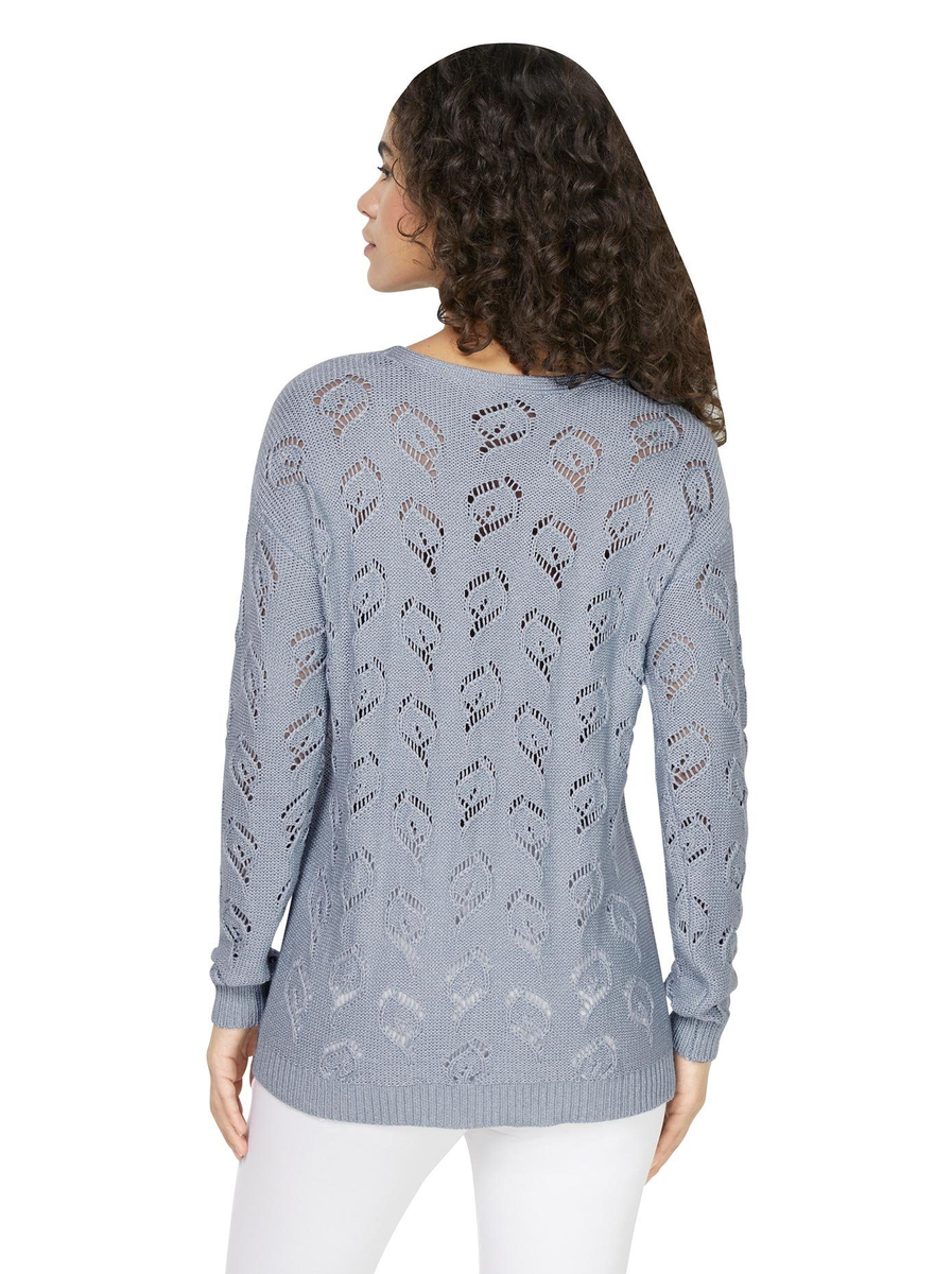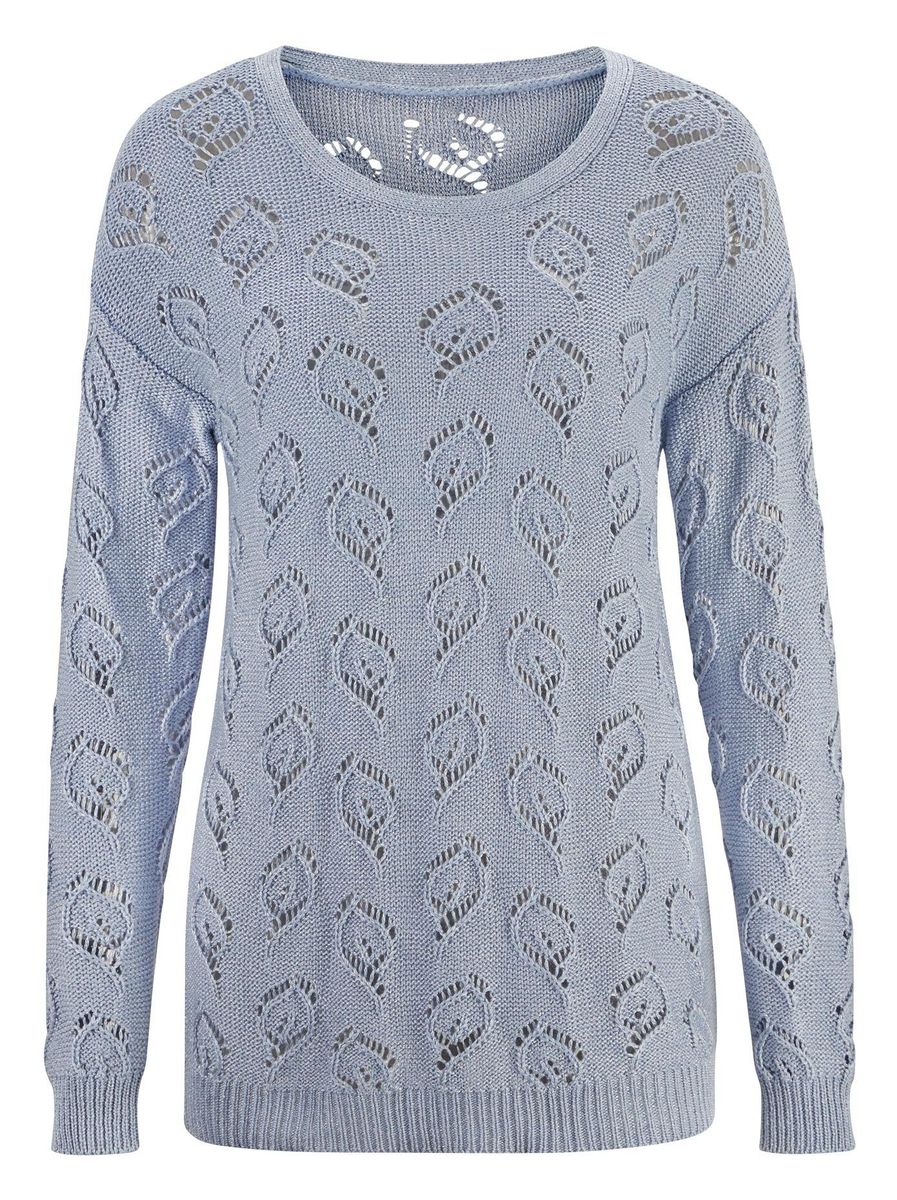 У этой модели - простой покрой (спущенное плечо) и удобный свободный рукав 3/4 (или 7/8). По центру - простой, но эффектный ажурный узор, по краям - рельефный узорчик.