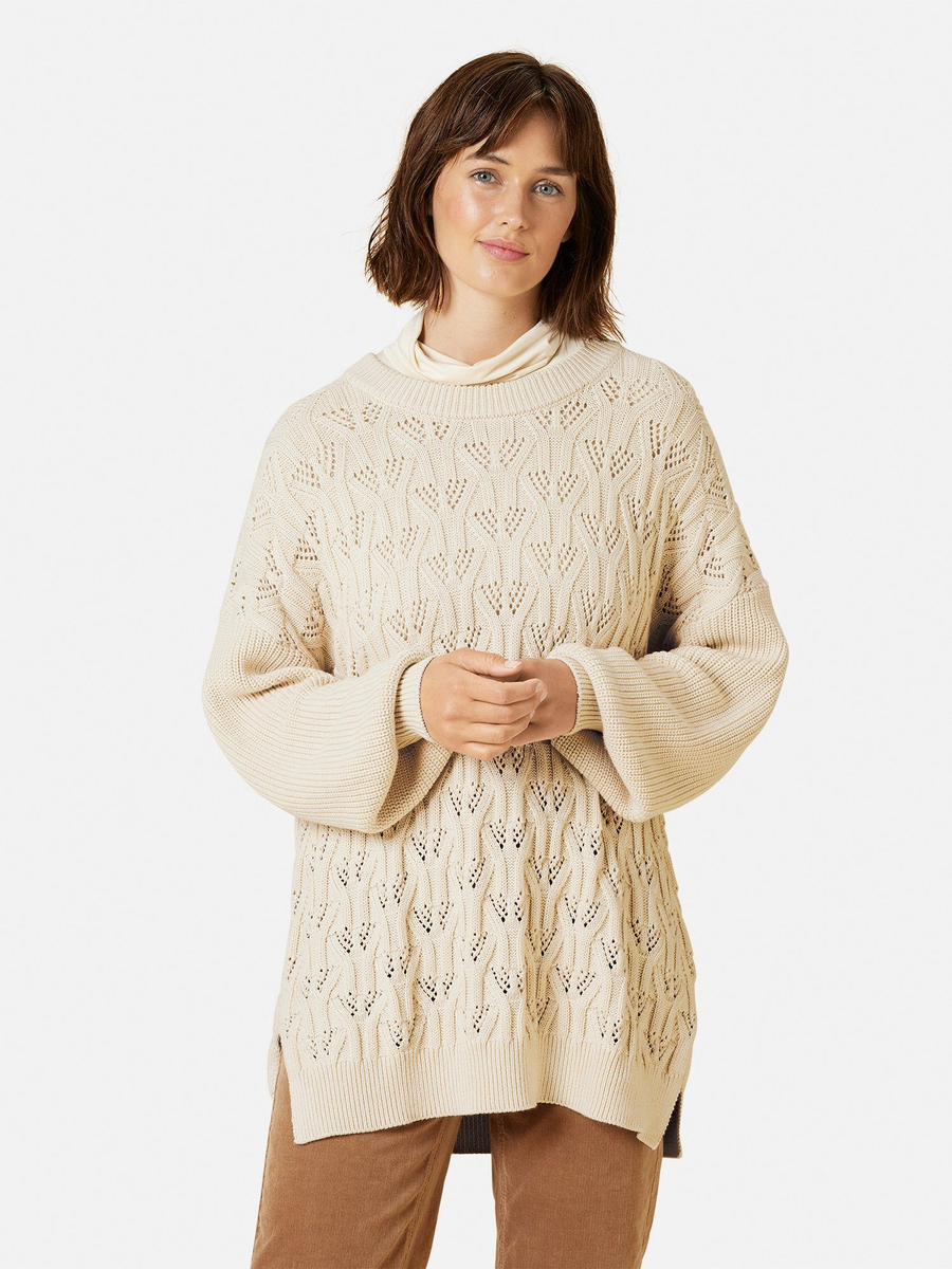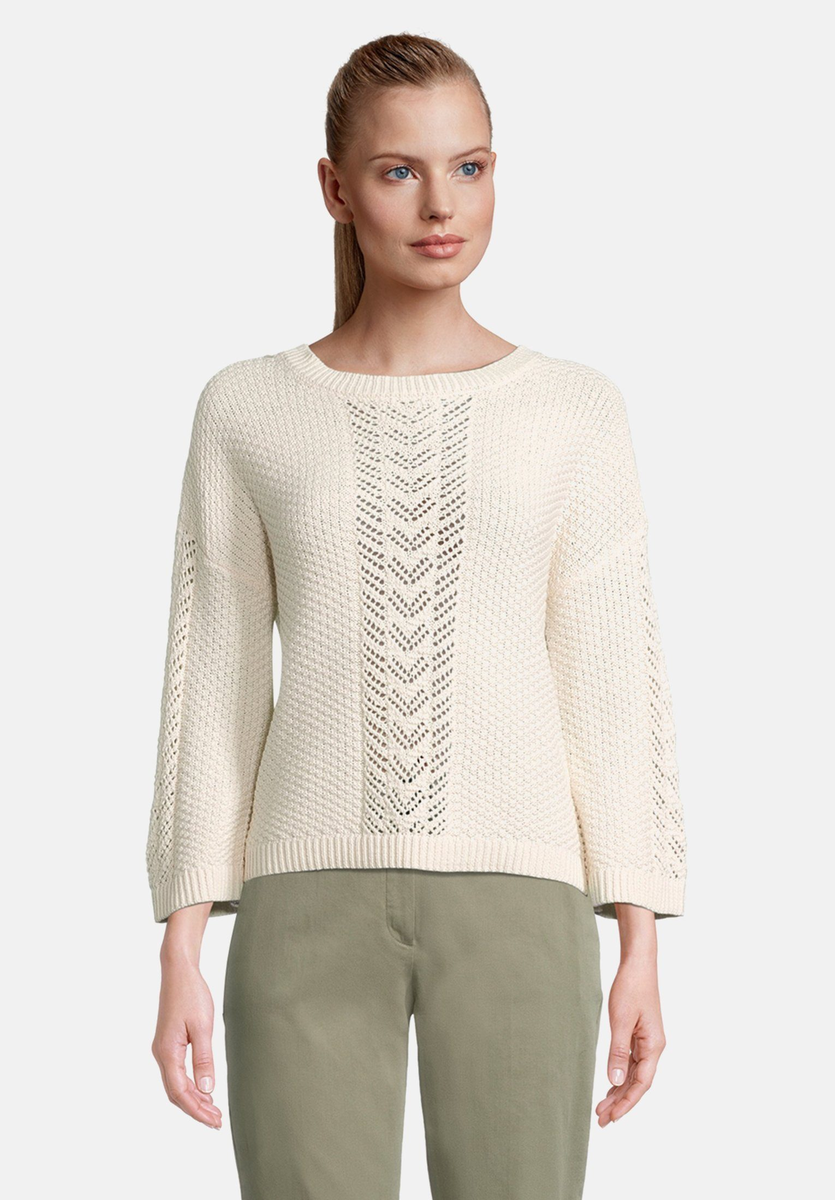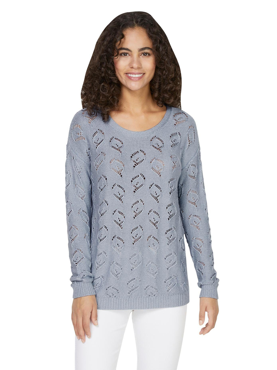 У этой модели - простой покрой (спущенное плечо) и удобный свободный рукав 3/4 (или 7/8). По центру - простой, но эффектный ажурный узор, по краям - рельефный узорчик.