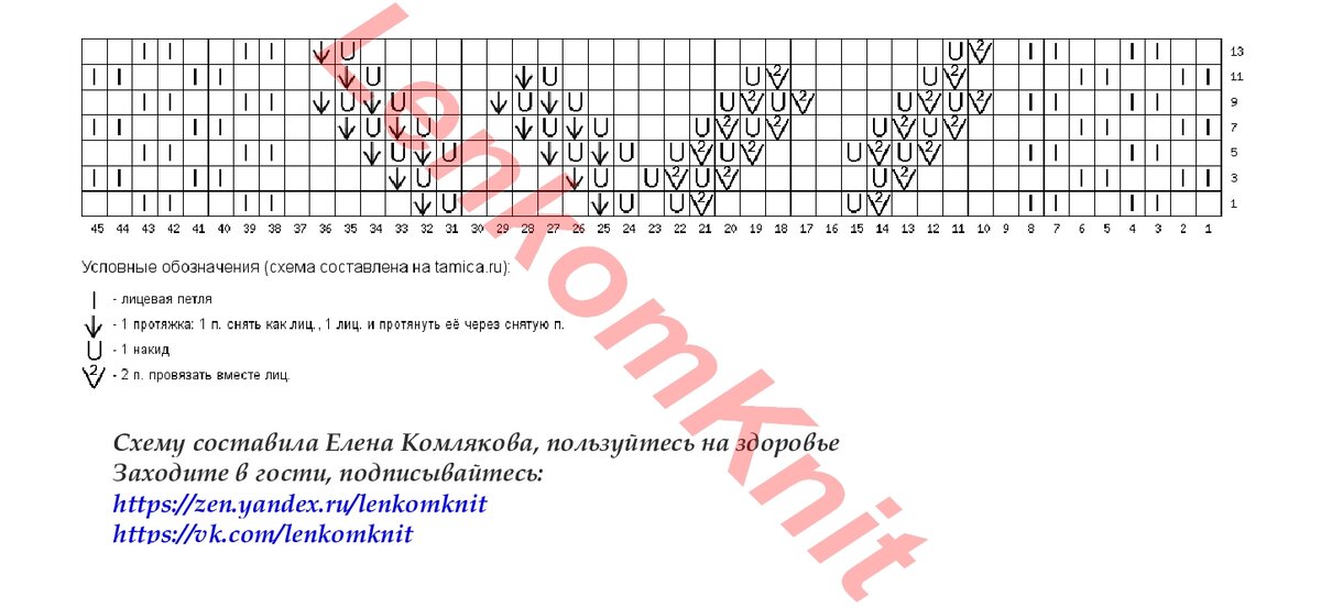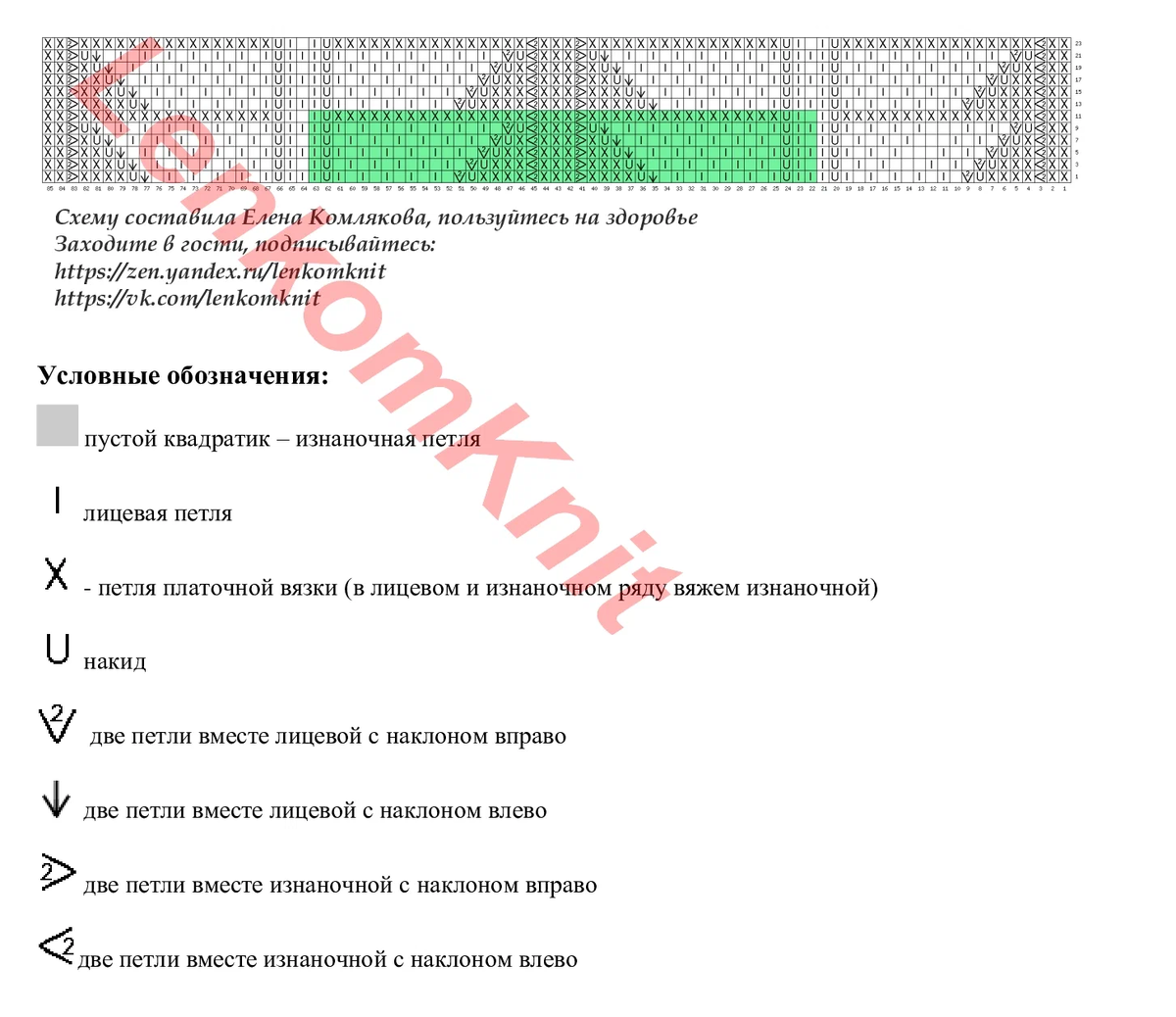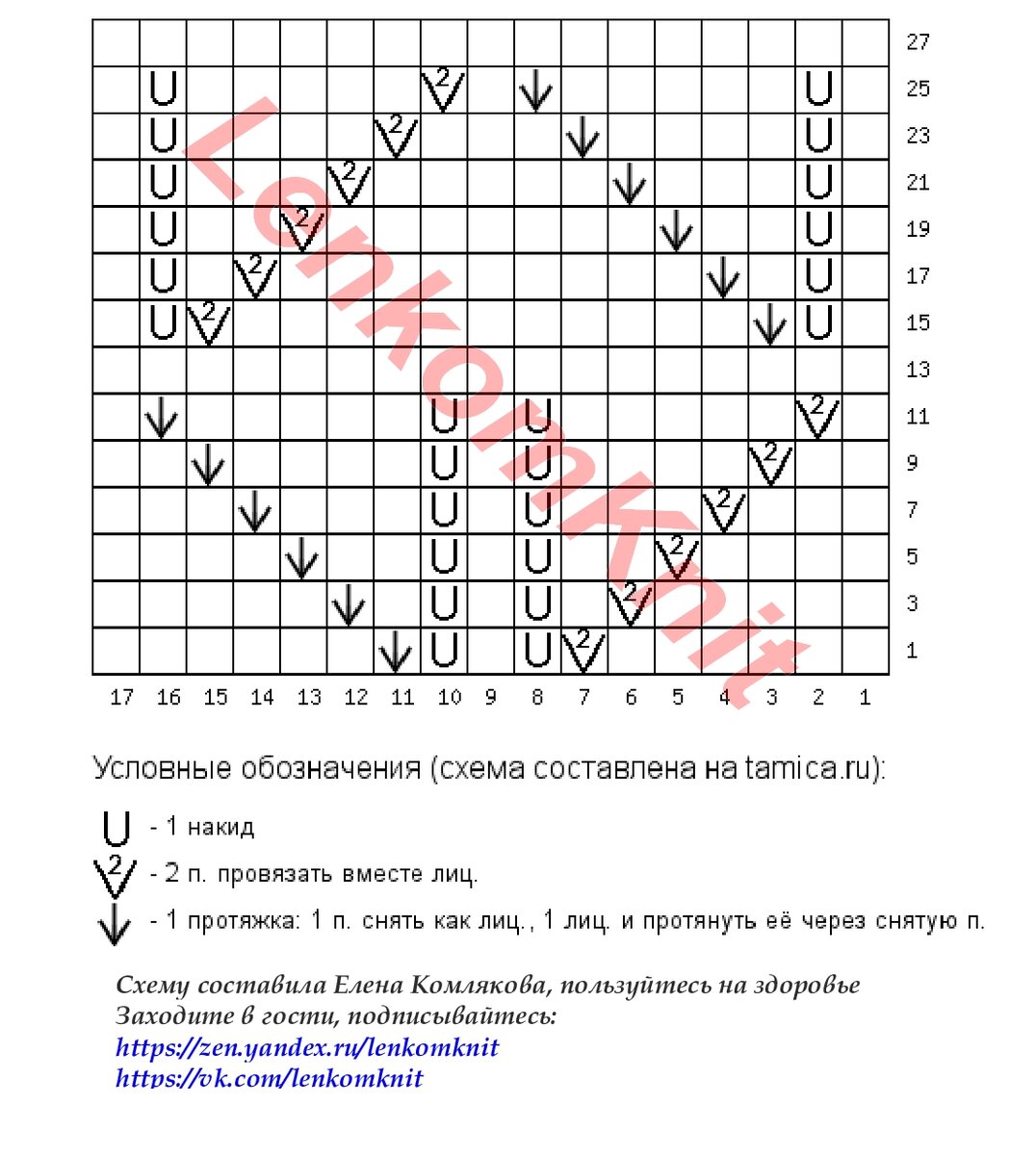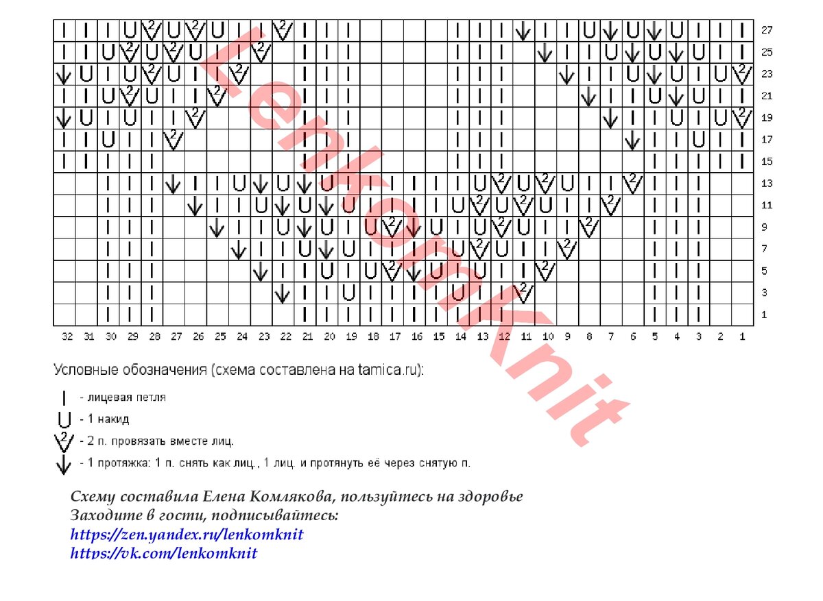 Этот узор вяжется в каждом ряду, поэтому требует внимания и усидчивости. Схема узора составлена для лицевых и изнаночных рядов. В высоту вяжем с 1 по 32 ряд, потом повторяем с 9 по 32 ряд.