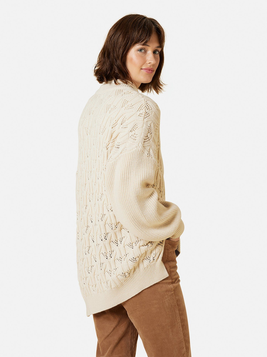 Спинка кардигана. Тут видно, что ажурный узор вяжется только по центру рукавов. Остальная часть рукава справа и слева вяжется лицевой гладью, но там есть диагональные тонкие полосы. Думаю, они получаются путем смещения одной изнаночной петли.