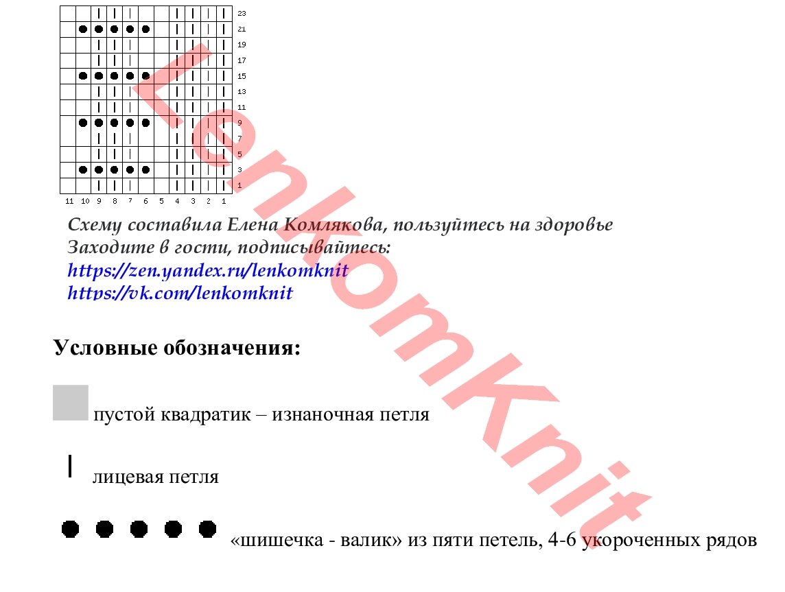Схема узора очень простая. В ширину раппорт 11 петель, в высоту - шесть рядов. Самое интересное в этом узоре - "шишечки-валики). Они вяжутся укороченными рядами. Петли, отмеченные черными точками, нужно вязать 4-6 рядов (выбрать, как больше нравится, при вязании образца). Таким образом провязанные петли в итоге будут выглядеть, как небольшие валики.