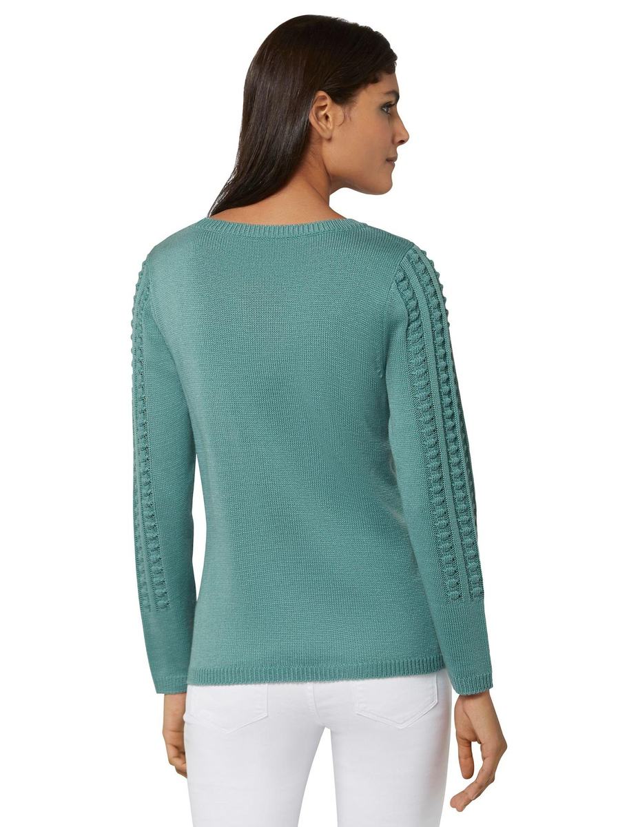 Я бы поменяла в этом свитере местами узоры. Перед и спинку связала бы лицевой гладью, а рукава - ажурным узором. И свитер получился бы модным, актуальным и не перегруженным узорами.