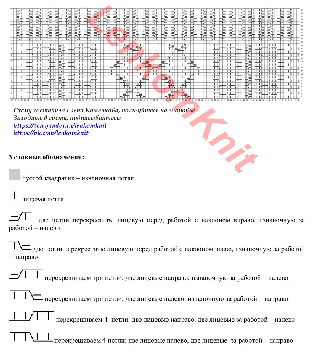 На схеме нарисован полный раппорт узора как в ширину, так и в высоту (лицевые ряды).