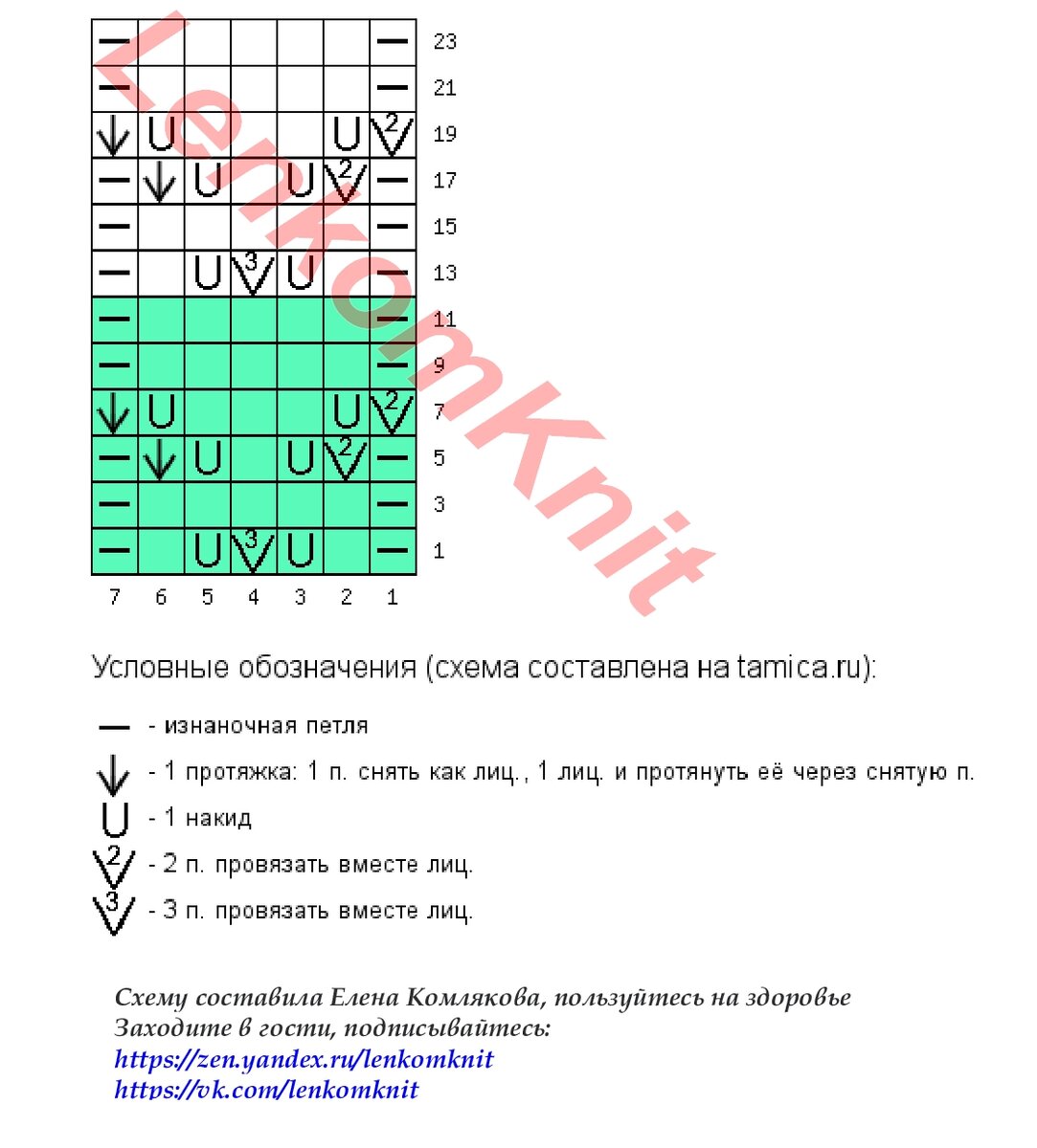 Схема узора, раппорт выделен зеленым цветом (семь петель в ширину и 12 рядов в высоту):