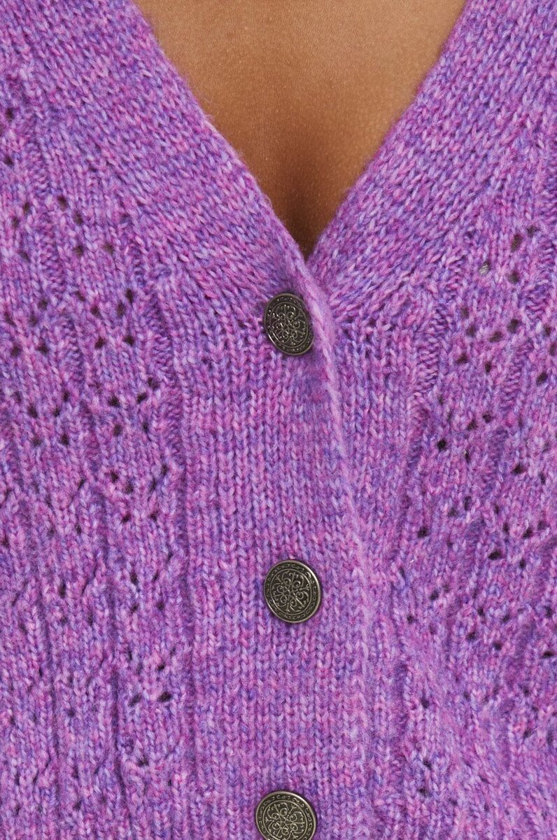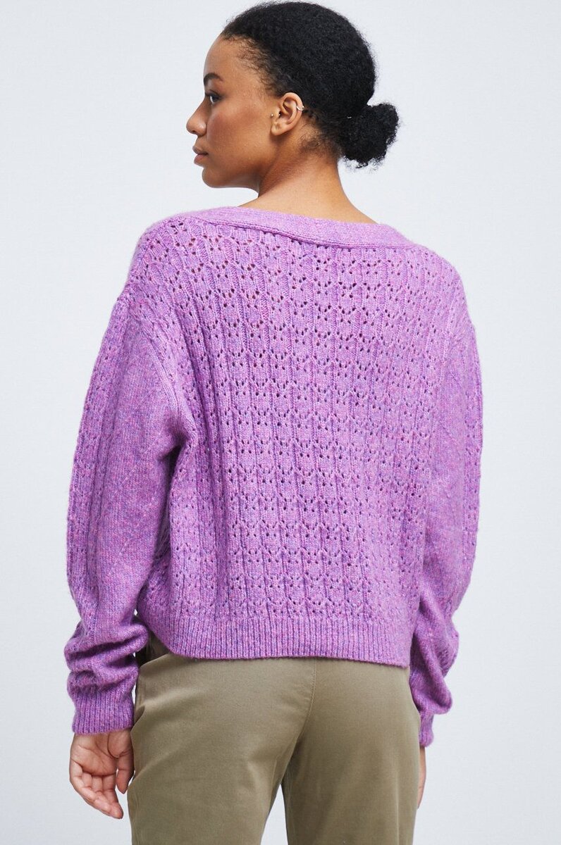 Девятая модель - яркий фиолетовый кардиган. Модель свободная, укороченная, с мелким вертикальным ажурным узором. Узор этот нераспространенный, смотрится интересно.